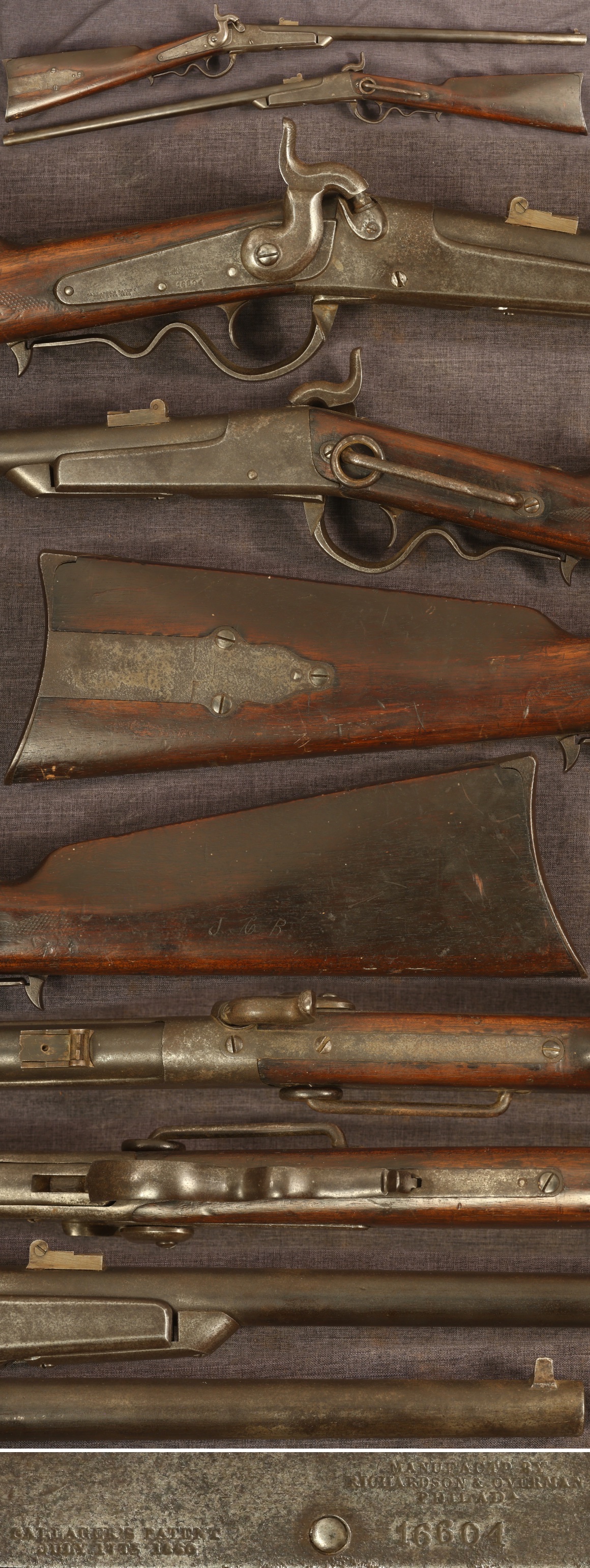Gallager's patent percussion breechloading saddle ring carbine. Serial number 16604. 22" round barrel. Metal parts have a dark patina with scattered light pitting. Rear sight is a reproduction. Buttstock is good, showing wear from use with scattered moderate handling marks and a vise impression in each side of the stock behind the lock. Initials "JCB" are neatly engraved in left side of butt. Mechanically good, sold as a collector item only, not warranted safe to shoot.