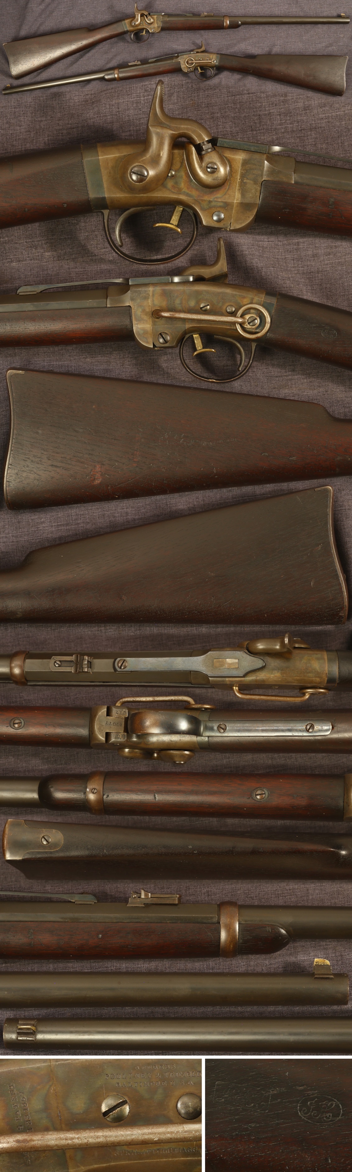 Smith patent saddle ring cavalry carbine. Serial number 10077. Standard production model in fine condition with strong original color casehardening on frame and strong original blue finish on other metal parts, showing a little thinning on the barrel, spot of missing blue on triggerguard, and mostly a brown patina on buttplate. Stocks are fine with an open grain suggesting only light use, has some scattered light handling and storage marks, and a small chip at the toe of the butt. Has two inspector cartouches in left side of wrist, one stronger than the other. Mechanically good, sold as a collector item only, not warranted safe to shoot.