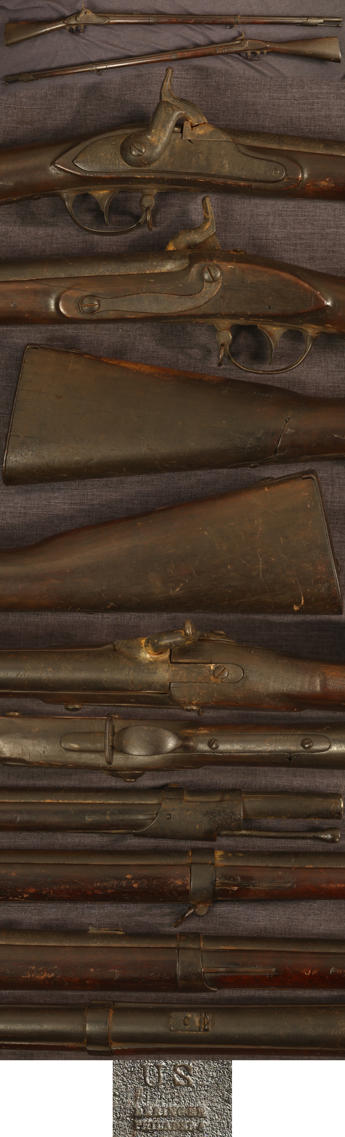 rare Henry Deringer M1816 style percussion rifled musket. Looks much like a M1816 musket, but was made up by Henry Deringer using newly made and leftover parts in the run-up to the Civil War. Marked on lock "US/DERINGER/PHILADELA". Distinctive long bolster and rear sight. 42" round barrel of .69 caliber rifled bore. 41" long tulip head ramrod. Metal parts have an untouched almost black patina with scattered light pitting. Sling swivels are stuck in place and the upper swivel is detached on one side. Nipple is broken off. Stock shows average wear and use overall with small crack in left side of forearm and by each lock screw, worn piece of wood missing from lower lock mortise, and some minor nicking to the ramrod channel. There is a large checked knot in the right side of the wrist, attesting to the less than prime quality materials that were being used on these guns going to the states. Mechanically good, sold as a collector item only, not warranted safe to shoot.