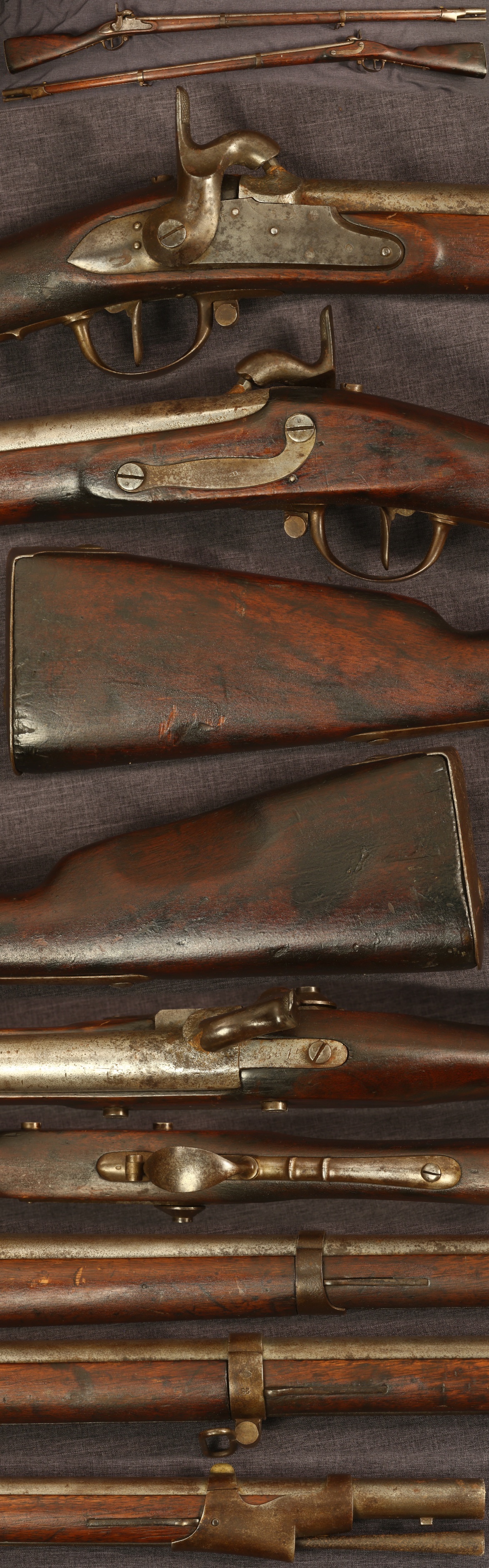 French M1815 percussion musket dated 1838. 42-3/4" barrel. Model marked on barrel tang and proofed in various places. Metal parts have a light patina overall with some pitting in the barrel breech area. Stock is good, showing wear from use, with an added old varnished finish. Free of cracks and chips with some minor dings in the ramrod channel edges. Mechanically good, sold as a collector item only, not warranted safe to shoot.