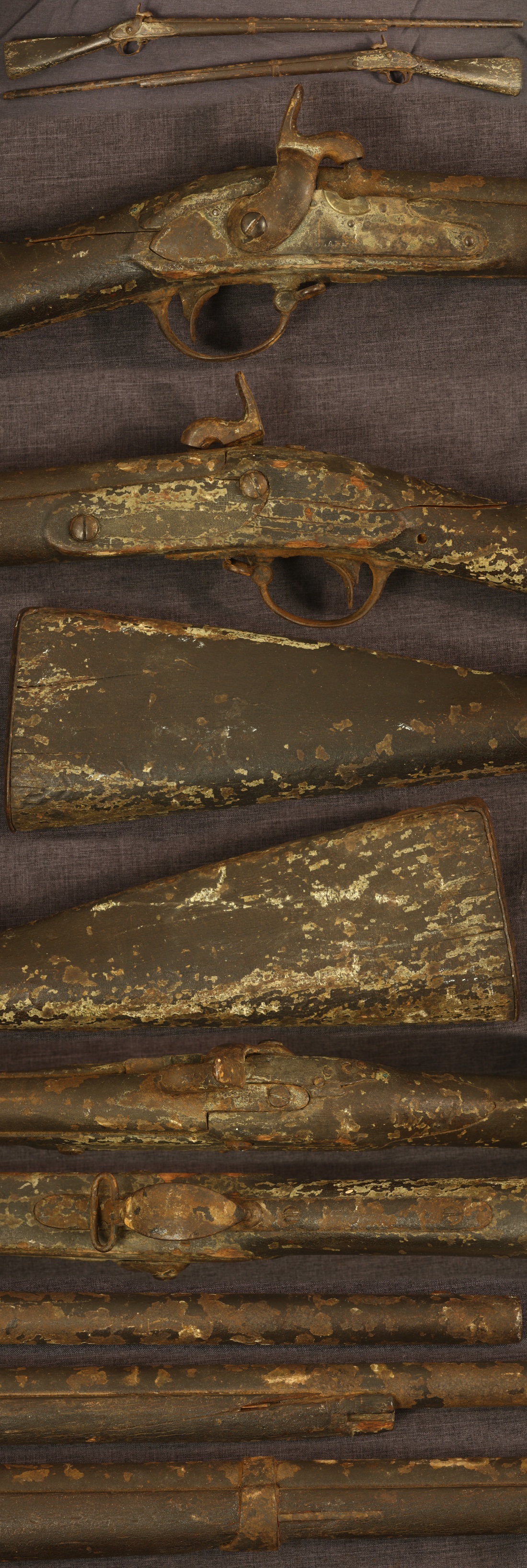 US M1816 contract musket by Blake, 1828, as marked on lock. Original length barrel, stock shortened to the location of the middle barrel band, which is absent. Gun is overall in untouched condition with rust showing where heavy old paint is chipped off. Stock has a wrist crack that shows movement, some age checking to the butt, and a diagonal crack with sliver on right side of forearm near middle band location. No ramrod. Hammer has spring tension but does not cock properly. Sold as a collector item only, not warranted safe to shoot.