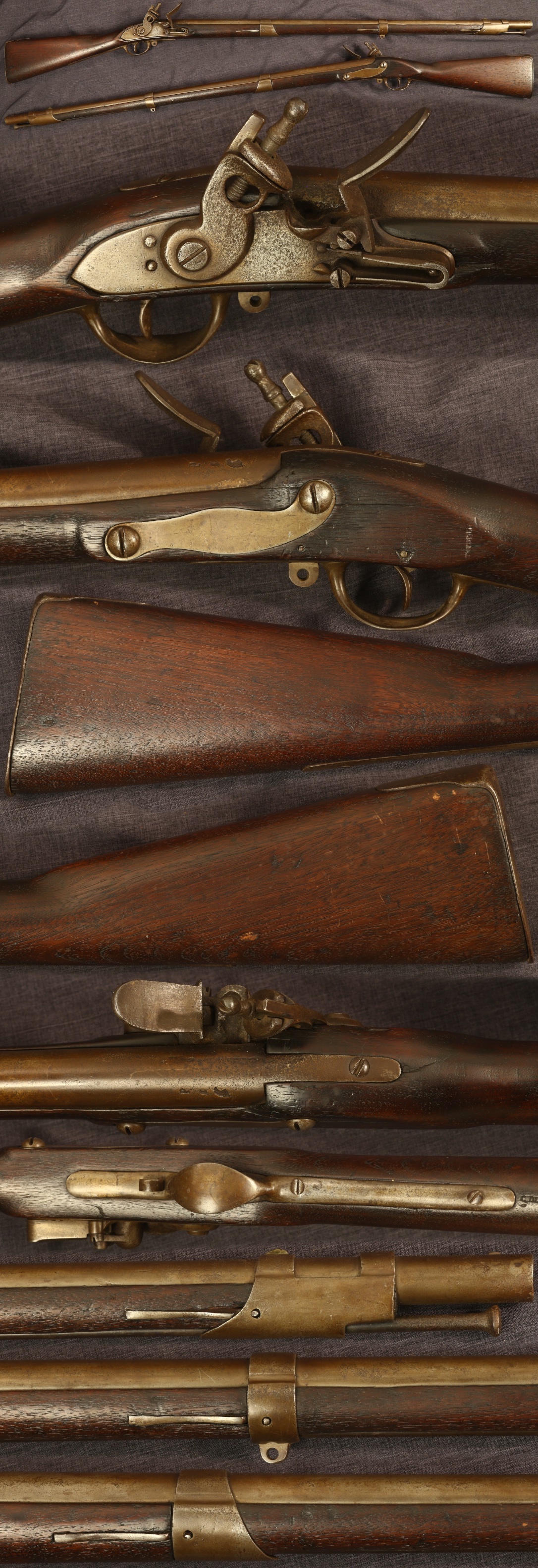 M1817 Artillery style short musket. 35-1/2" barrel proofed at breech. Only other marking is "C.DIX" in small letters behind the triggerguard. Even band spacing indicates this musket is at the original length. Metal parts have a medium patina overall with some light pitting on the lock and barrel breech. Sling swivels are absent, top cock jaw and screw are period replacements. Stock shows wear from use, may have been lightly cleaned, has a crack opposite the lock, small chip in lock mortise, and some worn slivering to the ramrod channel edges. Tumbler feels worn but action still works. Sold as a collector item only, not warranted safe to shoot.