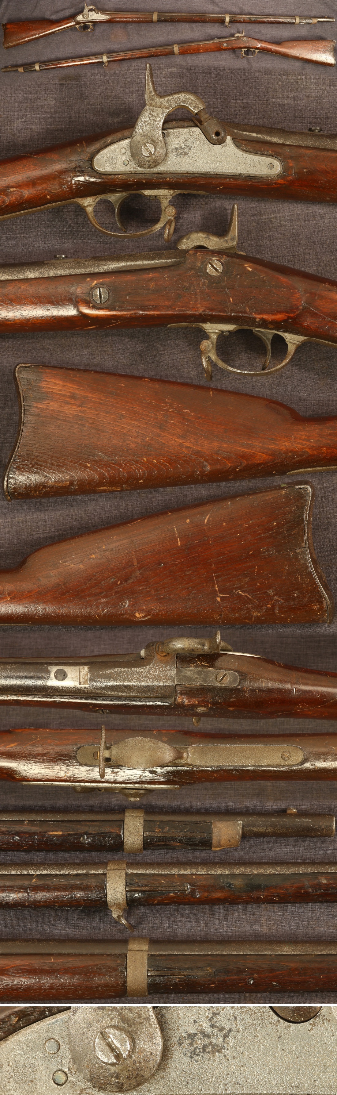 US M1861 Norfolk contract percussion musket, dated 1862 on lock. Original length barrel with rusty 0.58" smooth bore. Overall cleaned pitted metal surfaces with markings still discernible on lock. Bolster screw, rear sight, and ramrod are absent. Sling swivels are present but frozen in place and bent. Stock is heavily worn and finished with varnish, having a wrist crack and a crack below the rear of the lock. Lock is mechanically good. Sold as a collector item only, not warranted safe to shoot.