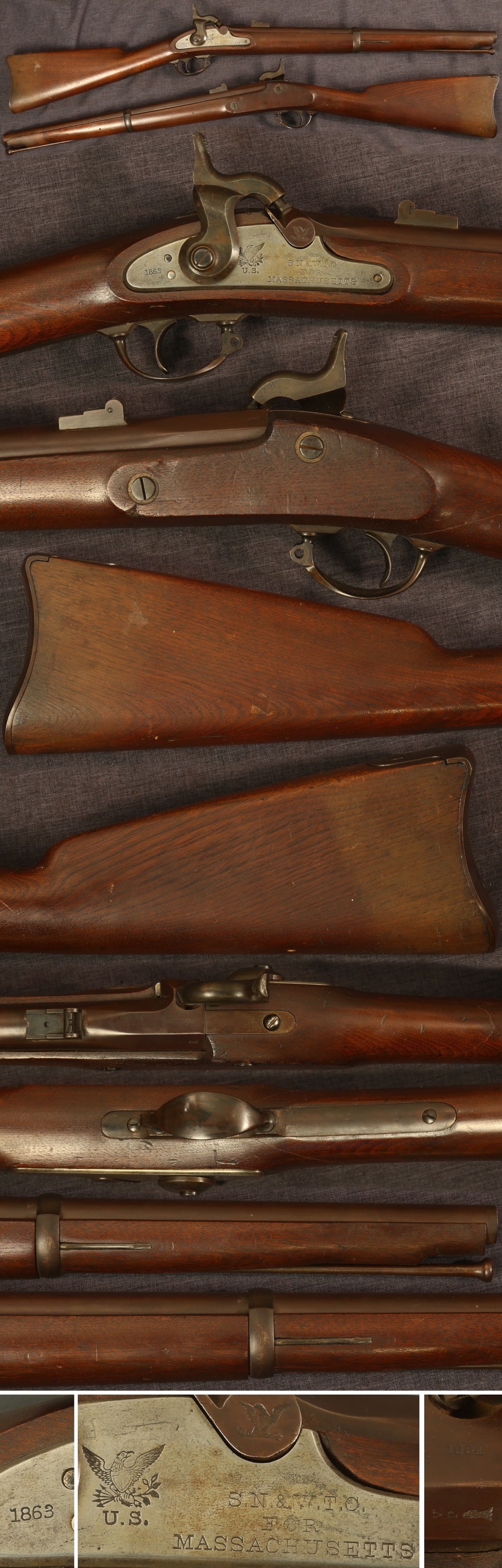 M1861 Special Model musket by S.N. & W.T.C. For Massachusetts. Barrel shortened to 20" with stock shortened accordingly. Nicely marked metal parts including barrel proofs and date of 1864. Metal parts have a brown finish except lockplate that is bright and hammer that is color casehardened. Stock is fine, showing minimal use, has a few moderate handling bruises, and a light wrist crack. Mechanically good, sold as a collector item only, not warranted safe to shoot.