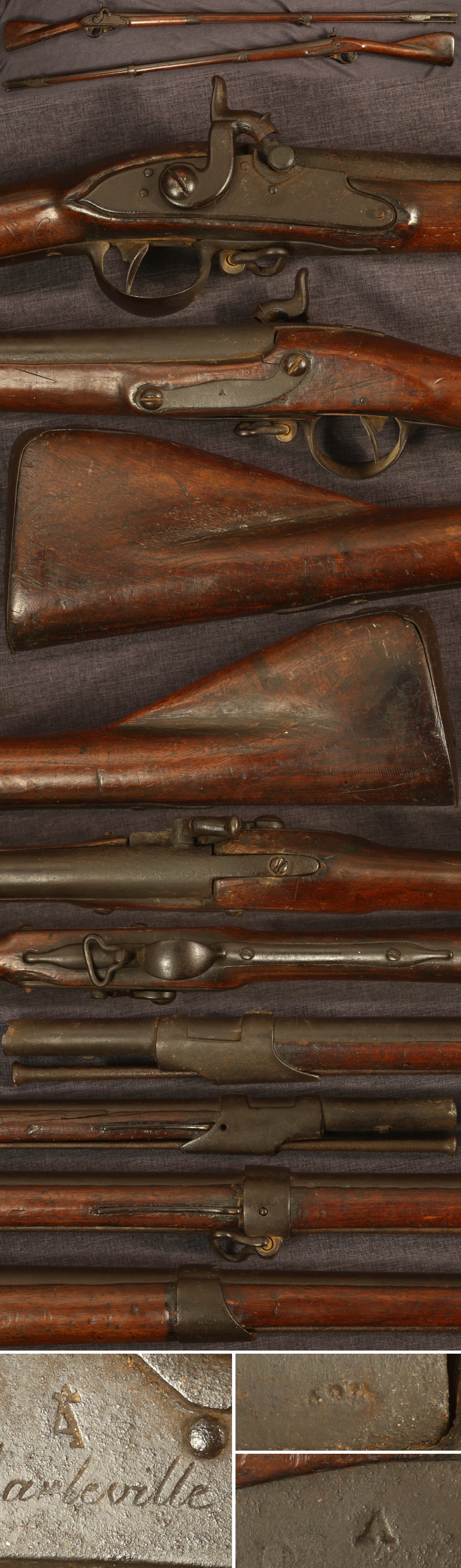 French M1763 Charleville percussion conversion musket. 44-3/4" round barrel. Excellent "Charleville" script marking on lock, French proofs present on lock, barrel, and sideplate. Metal parts have an untouched, almost black patina, with some expected pitting in the barrel breech area. Stock is well-worn with buttstock comb reduced during the period, a quality we have only seen on American-made muskets and models used in America, usually explained as allowing space for sighting while wearing large winter coats. Wood shows expected handling marks from many years of use, small crack by rear lock screw, several lateral grain cracks in the forearm, some well-worn slivers from ramrod channel, worn piece missing from lower lock mortise, and some minor slivers from around barrel tang. Honest, complete gun with even the sling swivels present. Mechanically good, sold as a collector item only, not warranted safe to shoot.