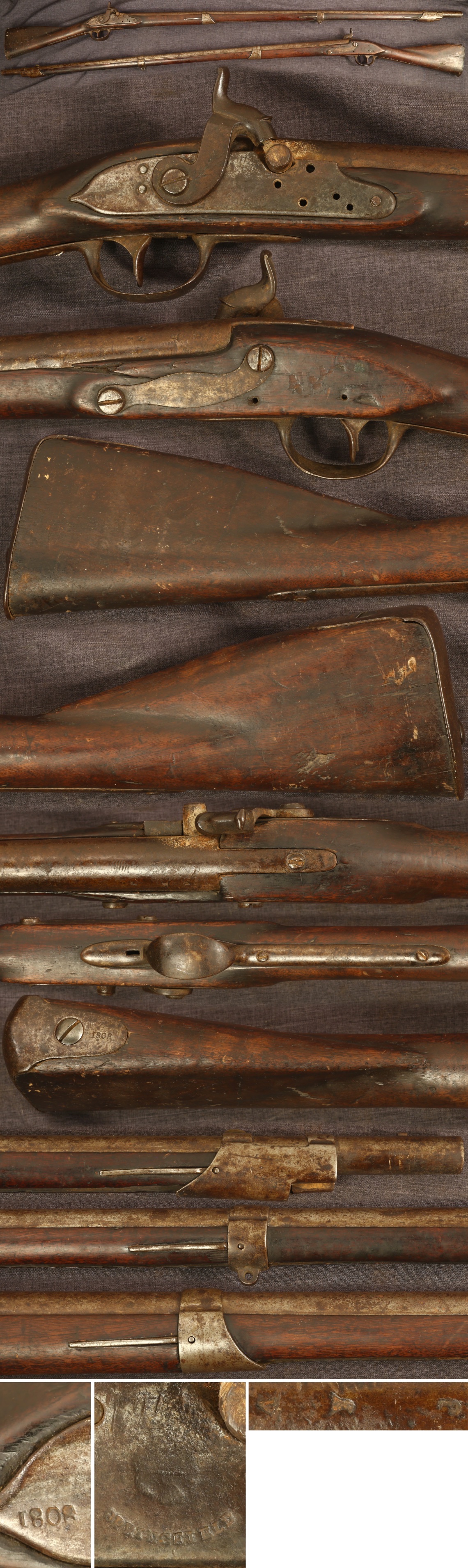 Springfield M1795 Type II percussion conversion musket, dated 1808 on lock and buttplate. Metal parts are mostly a medium to dark patina with some light rust on barrel and lock and lower band partially cleaned. Some pitting is present around the percussion drum. Stock shows a good deal of smooth wear from use, left side of comb skived down as often seen on early muskets. Wood has some expected moderate handling marks, crack above front of sideplate and crack in front of lock. Has a small worn chip behind middle barrel band and some minor chipping to the ramrod channel edges. Sling swivels and ramrod are absent. Lock is internally complete and functioning except missing mainspring. Sold as a collector item only, not warranted safe to shoot.