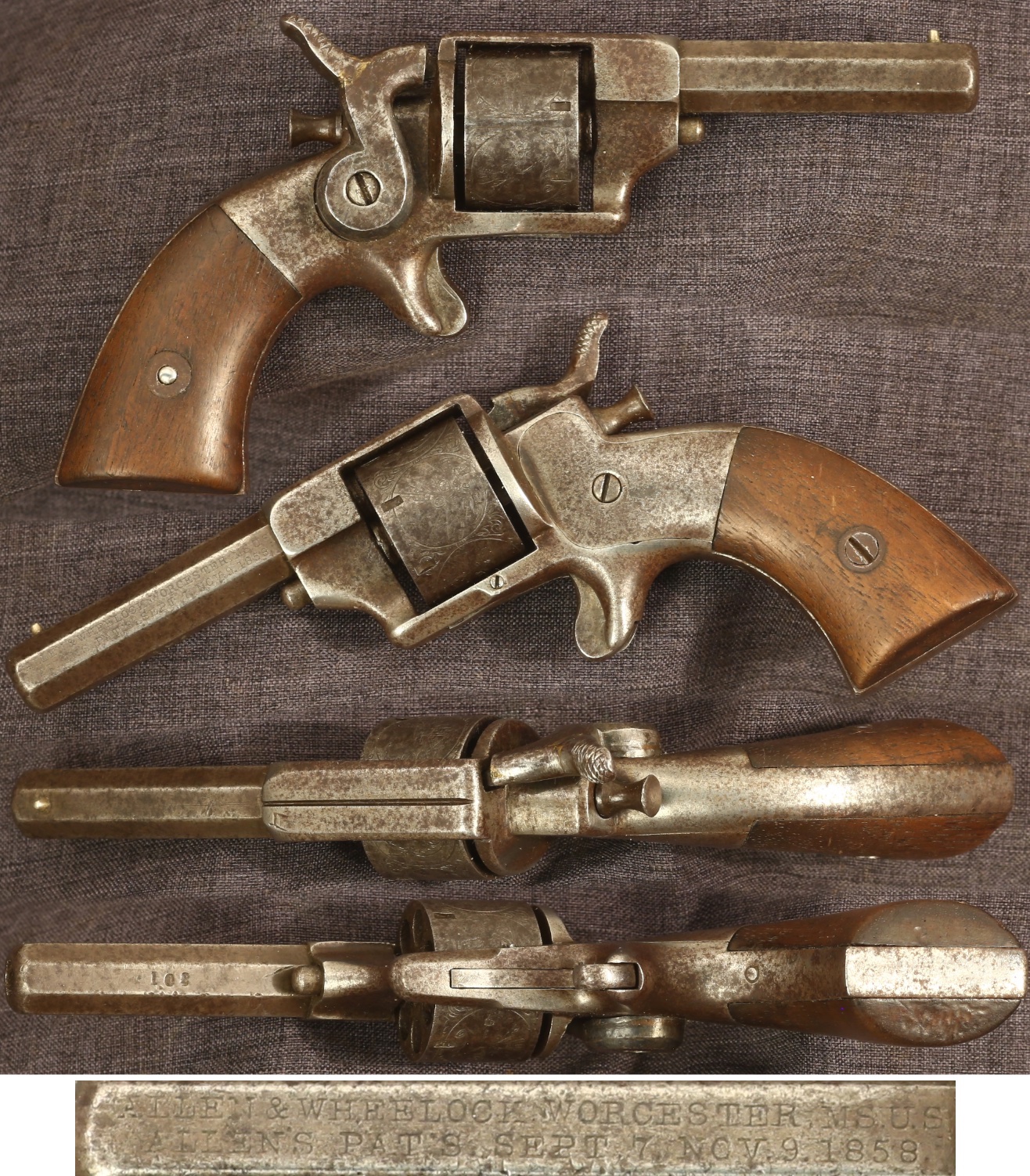 scarce Allen & Wheelock early type .22 caliber sidehammer revolver with rear-entry cylinder pin. Serial number 108. 2-1/2" octagon barrel with marking on left side. Metal parts have a light to medium gray patina with slightly granular surfaces. Cylinder has fine roll-engraved embellishment of different scenes including the Arms of Massachusetts. Wood grips show average wear from use, including some dings on the butt. Hammer spur has been repaired. Hammer has spring tension but does not cock, cylinder does not revolve. Sold as a collector item only, not warranted safe to shoot.