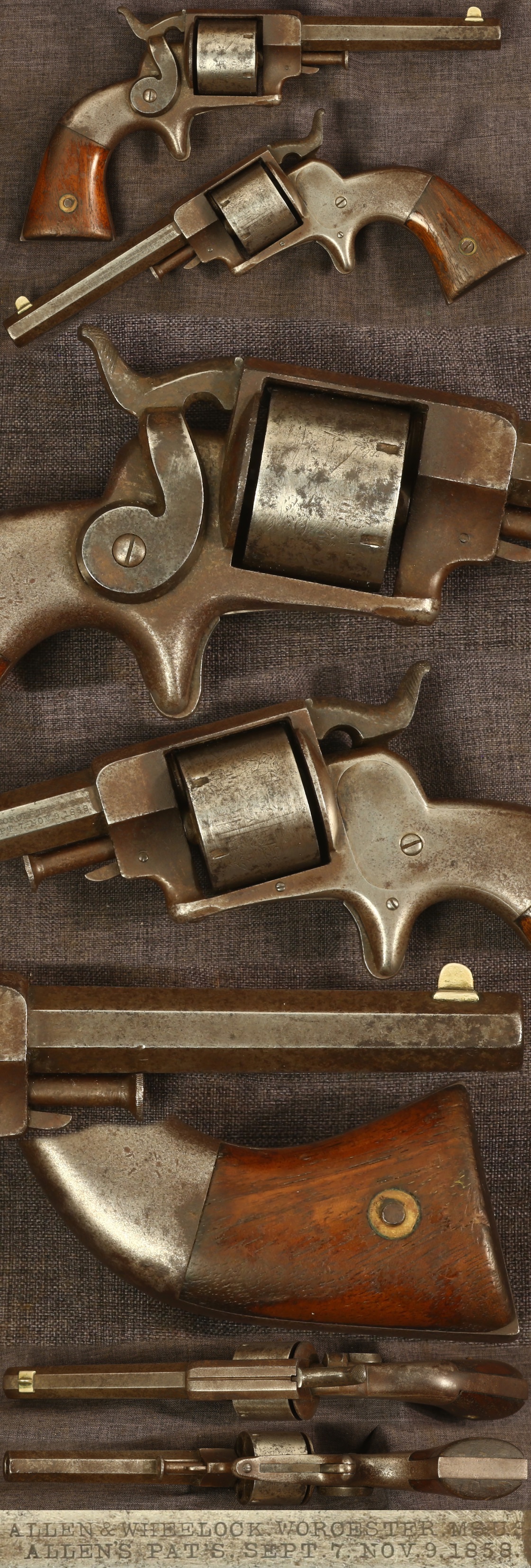 Allen & Wheelock .32 rimfire sidehammer revolver. Serial number 582. 4" octagon barrel nicely marked on left side. Retains much of the original roll engraved cylinder scene. Metal parts have a light to medium patina overall. Walnut grips have traces of the original varnished finish, showing several worn corner nicks. Mechanically good, sold as a collector item only, not warranted safe to shoot.