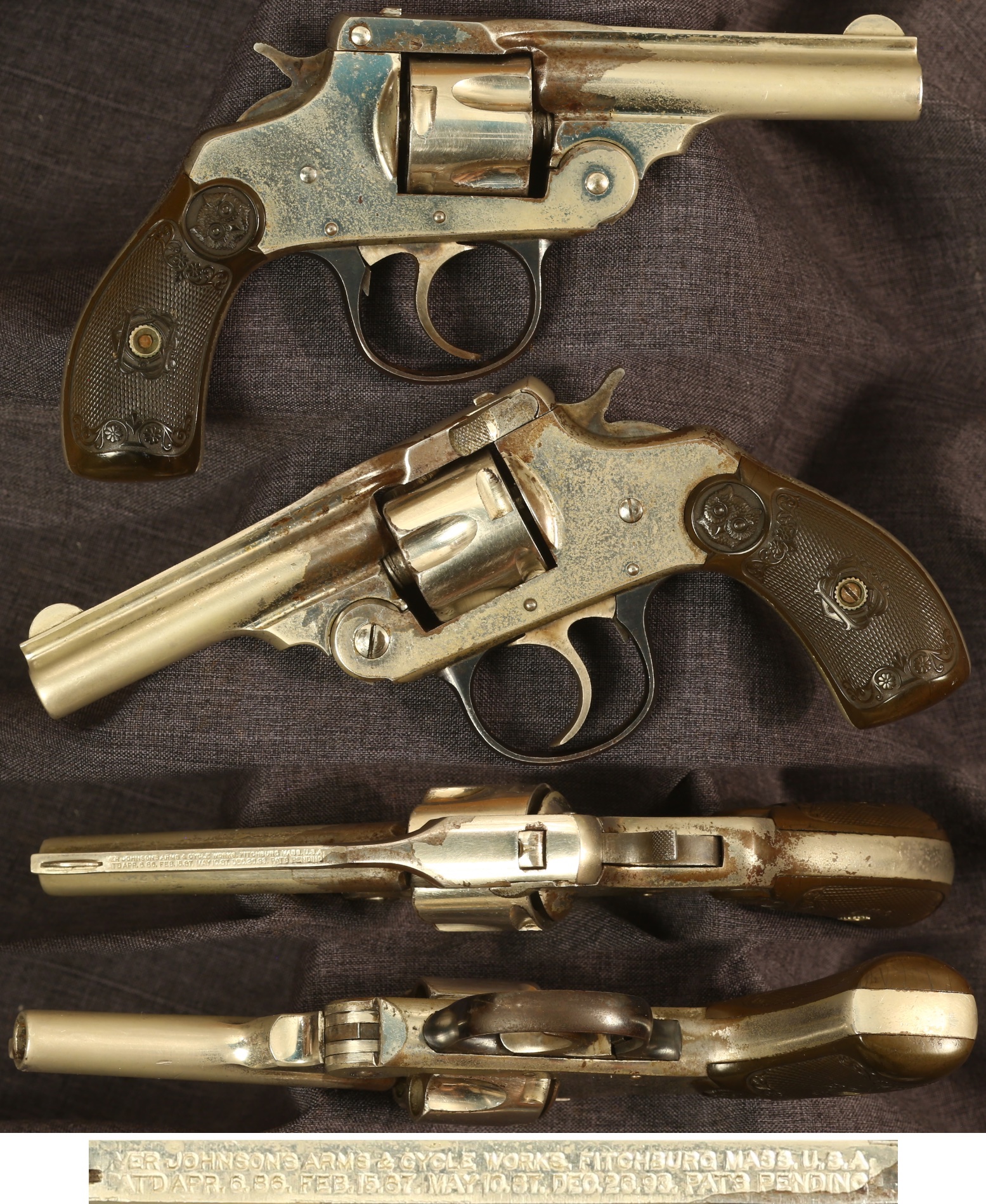Iver Johnson early style 32 caliber hammered revolver with left side frame release. 3" ribbed round barrel. Marked on top of barrel rib. Has much of the original nickel finish with some peeling to the barrel breech and frame top strap. Blued triggerguard and color casehardened hammer. Owl trademark hard rubber grips are very good, free of cracks and chips, showing light wear and use. Mechanically good, sold as a collector item only, not warranted safe to shoot.