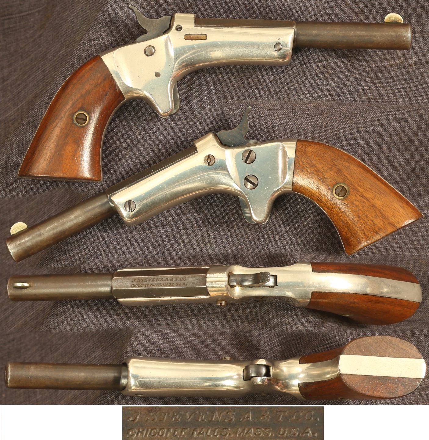 J. Stevens "tip up" single shot .22 caliber pocket pistol. Serial number 33797. 3-1/2" part octagon, part round barrel with frame notch rear sight and fixed blade front sight. Fine nickeled frame and blued barrel. Wood grips are fine, showing light handling marks but free of cracks and chips. Mechanically good, sold as a collector item only, not warranted safe to shoot.