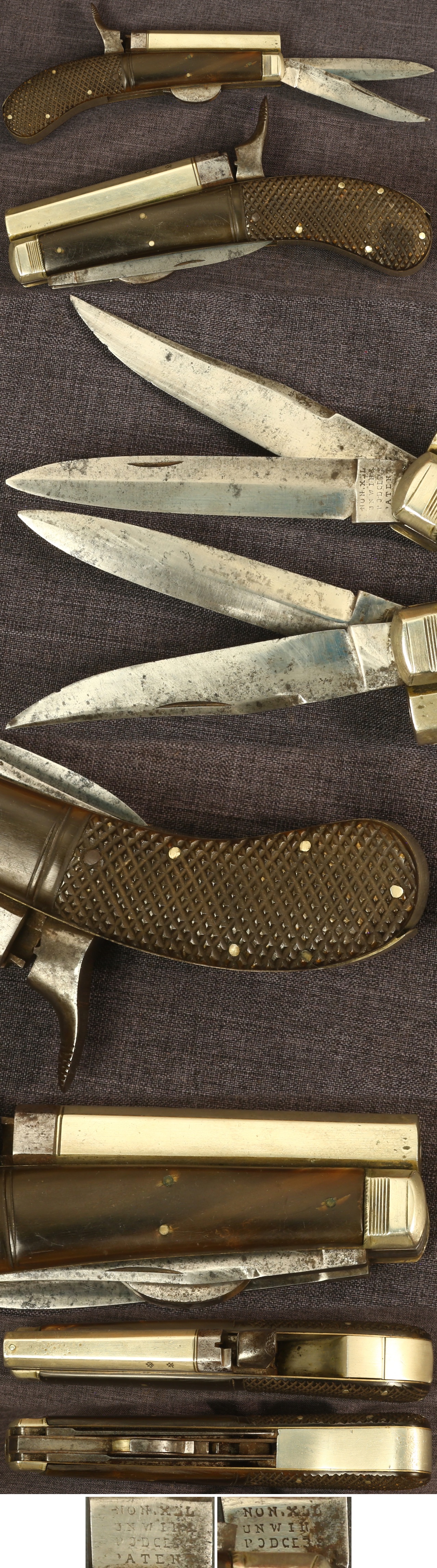 Unwin Rodgers cartridge knife-pistol. Marked on each of two knife blades "NON XLL/UNWIN/RODGERS/PATENT" and British proofed on barrel. 3-1/2" German silver barrel of about 6.6mm bore. Other mountings are also German silver, has a cartridge box with hinged lid on the grip backstrap, and butt shows some dings from improper use as a hammer. Knife blades are 3-1/2" long with one dagger profile and one clip point, both have a salt-and-pepper coloration with some evidence of sharpening and cleaning. Checkered horn side slabs are very good, showing light scratches from carrying. Breech extractor is absent. Hammer has spring tension but does not cock. Sold as a collector item only, not warranted safe to shoot.