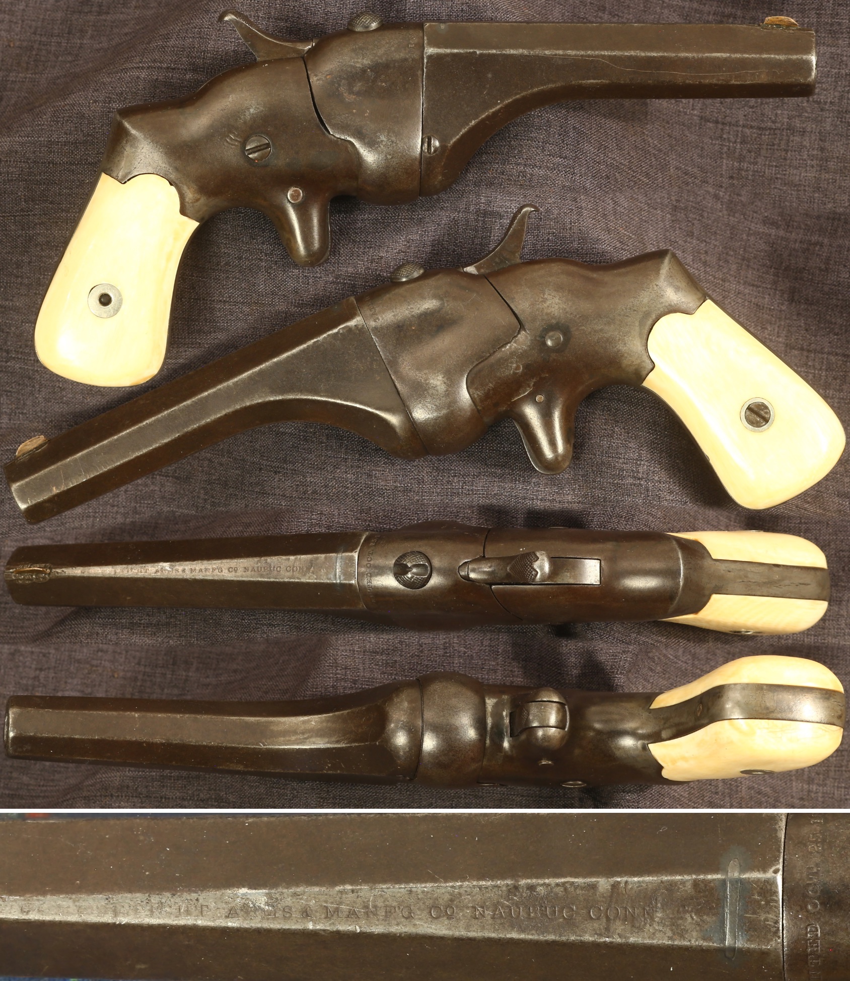 Hammond's patent "Bulldog" single shot .44 rimfire caliber single shot derringer by the Connecticut Arms & Manufacturing Company of Naubuc, Connecticut. Serial number 1609. Standard markings on barrel and breech block, showing some wear on the barrel. Novel action that swings open to the side for loading. Standard 4" barrel. Metal parts have a medium to dark brown patina overall. Replaced front sight. White bone grips have factory pencil serial number on the inside matching, showing a smooth, attractive appearance with only a couple tiny edge nicks. Action functions but breech block lockup is loose, sold as a collector item only, not warranted safe to shoot.