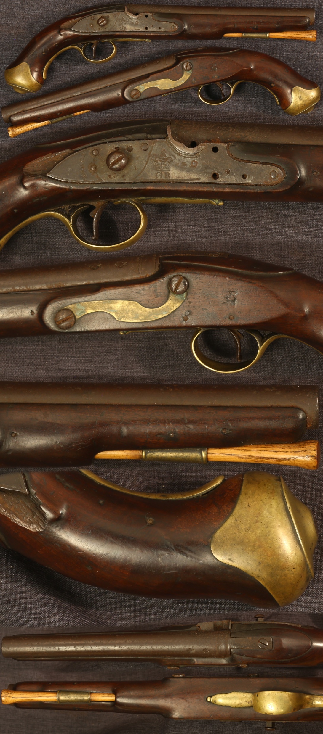 British TOWER flintlock dragoon pistol. 9" round barrel with British proofs, about .69 caliber bore, about 15-1/2" overall. Oddly, this gun appears to be a partially done conversion to percussion, with the flintlock parts removed from the lock and flashpan rendered about flat with the lockplate, but the remnant of the flashpan shows a great deal of erosion matching pitting on the barrel, which is absolutely original flintlock. It really appears that a conversion was started, but then not completed, perhaps the gun was judged to not be in good enough condition, or other more pressing work had to be completed and this was just forgotten about. Either way, it makes quite a curiosity of the armorer's work, or an excellent candidate for reconversion to flintlock, as the flash hole is a very hard aspect to make appear correctly when performing this work. Brass parts have light to medium patina overall, iron parts have dark patina with light scattered rust and expected pitting in the flash hole area. Stock has an "R.T" marking opposite the lock, possibly a stock maker or storekeeper marking, shows average wear and use overall with minimal scattered marks from handling, has some missing wood around the lock mortise that is very well worn. Nice beaver tail carving around barrel tang. Lock is internally complete and clearly hadn't been out of the gun in a long time. Sold as a collector item only, not warranted safe to shoot.