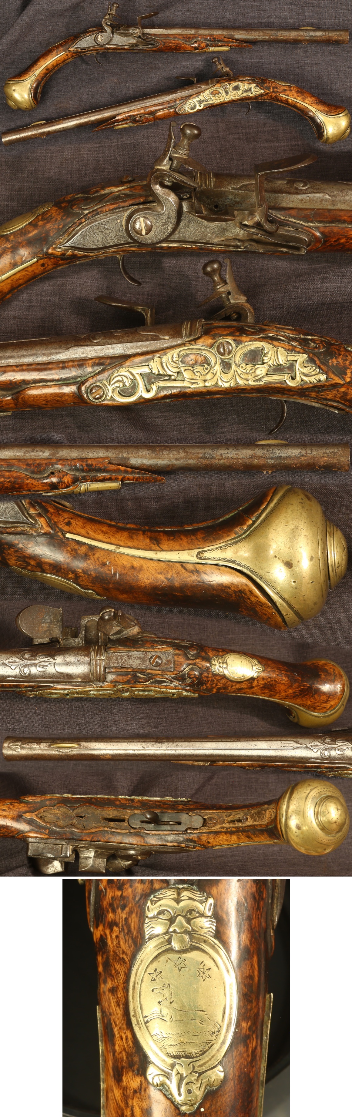 C1720-1750 Dutch-Germanic long flintlock pistol for restoration. Missing part of forearm and triggerguard. 13-1/2" barrel with flared muzzle about 0.68" diameter, about 20-1/2" overall. Detailed engraving on lockplate, wrist escutcheon with grotesque mask and crest of fox running with three stars above it, sculpted and cutout sideplate with heads of dragons opposing each other, and nicely sculpted barrel. Gun overall shows average wear and use overall with light patina overall. Stock is nicely grained and border carved, having a little chipping in the lock mortise and a couple light cracks in the grip, forearm is absent from just in front of the ramrod ferule forward. Mechanically good, sold as a collector item only, not warranted safe to shoot.