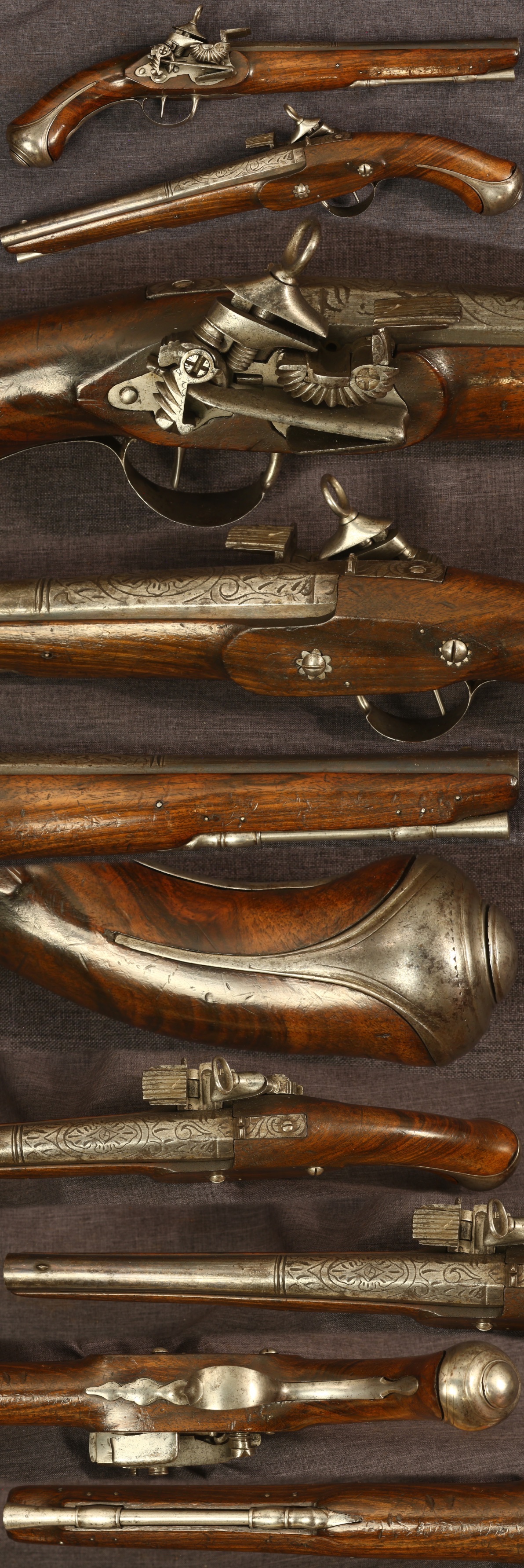 large Spanish miqulet flintlock belt pistol. 10-5/16" part octagon, part round barrel of about .58 caliber bore, about 16-3/4" overall. Fancy part octagon, part round barrel with embellishment to octagon portion. Iron mountings are attractively shaped, lock has interesting shaping to parts. Iron parts have light gray patina overall with little to no pitting. Stock shows light wear and use overall, free of cracks and chips, with numerous minor marks from handling. Mechanically good, sold as a collector item only, not warranted safe to shoot.