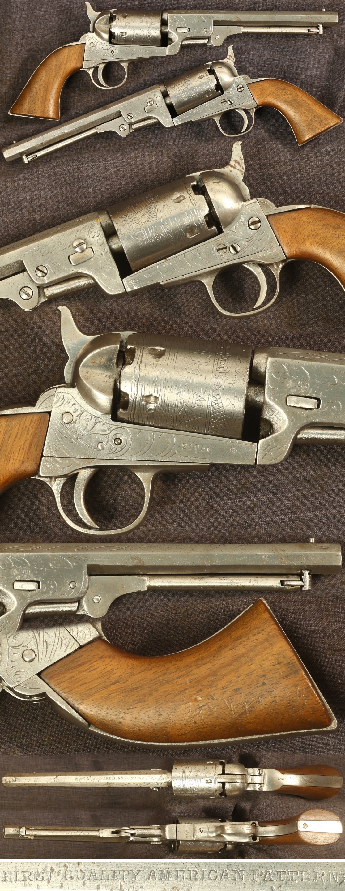 Belgian made Colt brevette (period copy) of a M1851 Navy revolver. Serial number 21966. Marked on top of octagon barrel "FIRST QUALITY AMERICAN PATTERN". 7" barrel. 35 caliber marking on frame and triggerguard. Metal parts are nicely engraved and have light gray surfaces overall. Wood grips are good, slightly undersized from having been cleaned, free of cracks and chips, showing scattered minor marks from handling. Mechanically functional aside from cylinder stop is weak. Sold as a collector item only, not warranted safe to shoot.