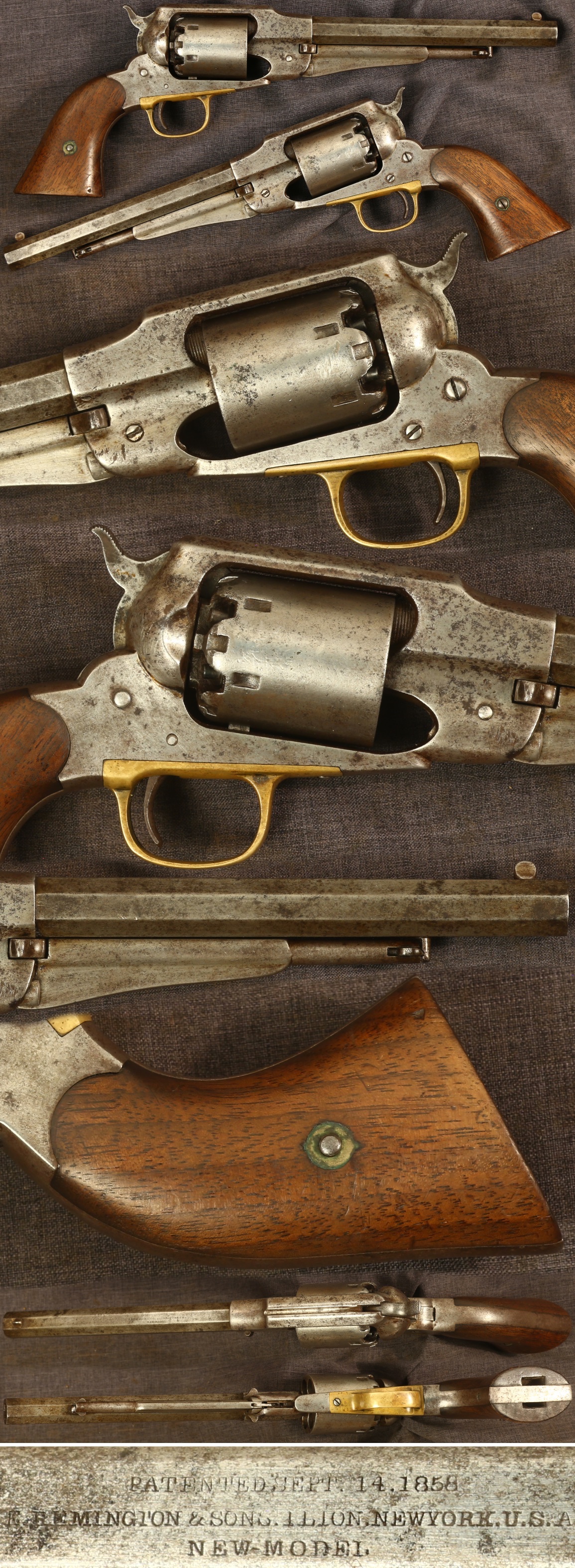 Remington New Model Army .44 caliber revolver. Serial number 56537. Standard military contract model with faint but visible inspector cartouche on left grip. Metal parts have a mottled light to medium gray patina overall with some scattered light pitting. Wood grips are good, showing some scattered marks and scratches from use, and a couple minuscule corner nicks. Has a slot cut into the butt of each grip to facilitate attaching a lanyard. Mechanically good, sold as a collector item only, not warranted safe to shoot.