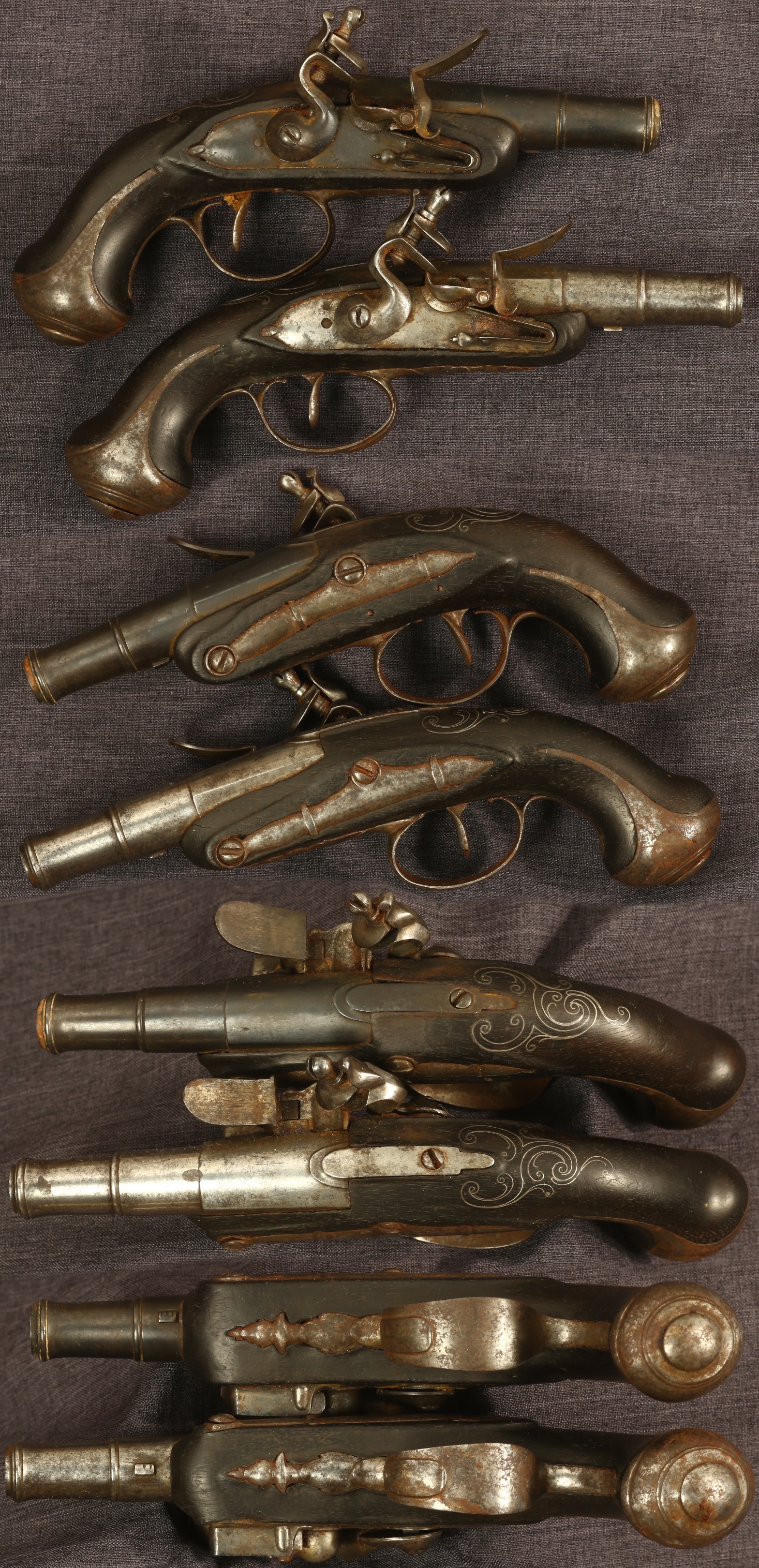 Pair of C1760-80 turn-off barrel flintlock coat pistols. No markings apparent. 3-3/8" barrels, about 7-1/4" overall. Metal parts are a silver patina on one and darker on the other. Barrels and furniture are nicely shaped but plain. Stocks are very good, showing light wear and handling, darker gun has a couple diagonal hairline cracks and small sliver by barrel tang, lighter gun has a couple tiny hairlines in left forearm edge, small sliver by barrel tang, and small sliver under lock. Both are mechanically good. Sold as a collector item only, not warranted safe to shoot.