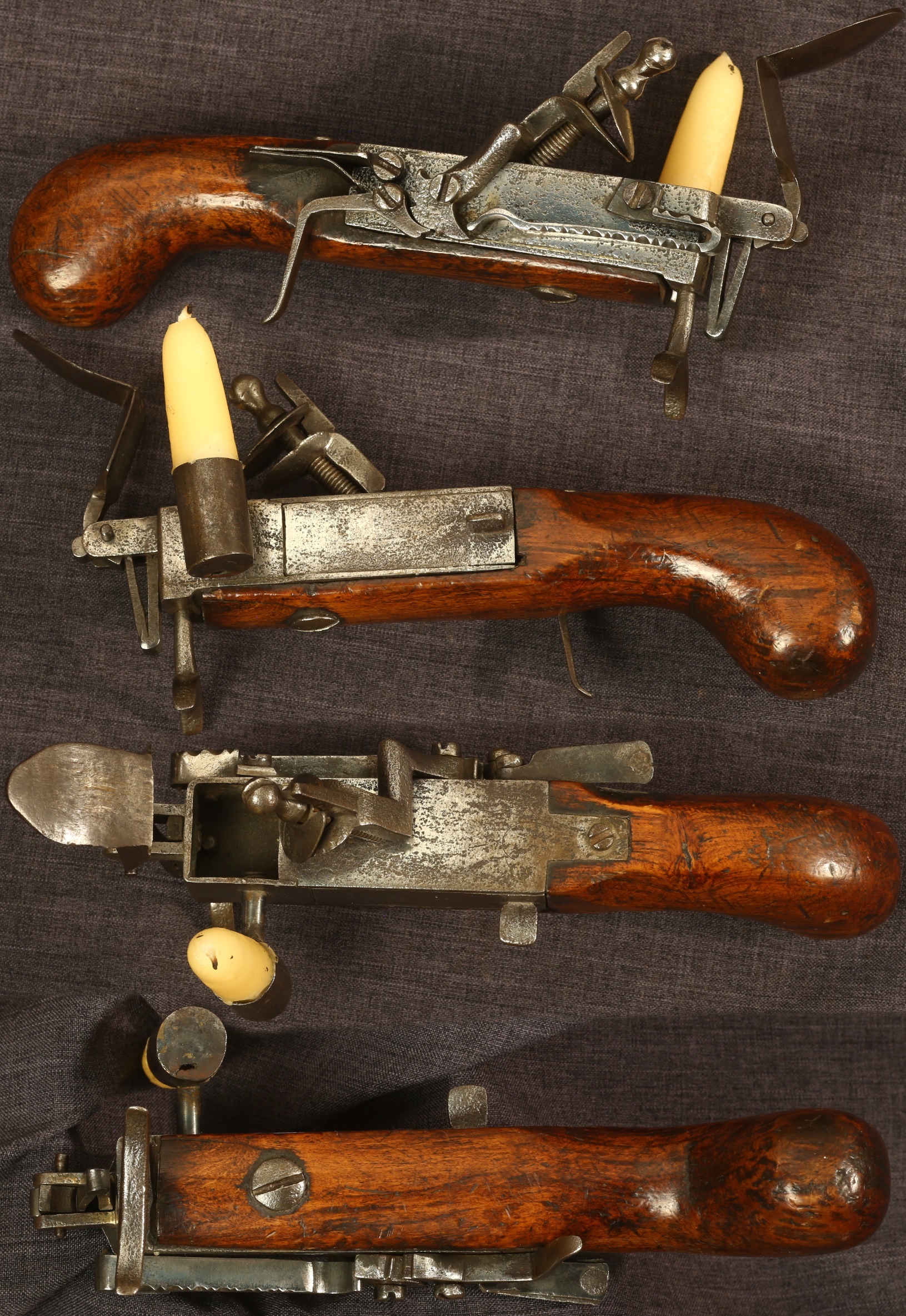 C18th century flintlock external action tinderlighter. 7-1/2" overall length. Pull-open tinder storage compartment in left side of device. Iron parts are clean with overall light to moderate pitting. Wood grip shows average wear and use overall, free of cracks and chips with expected handling marks. Mechanically good.