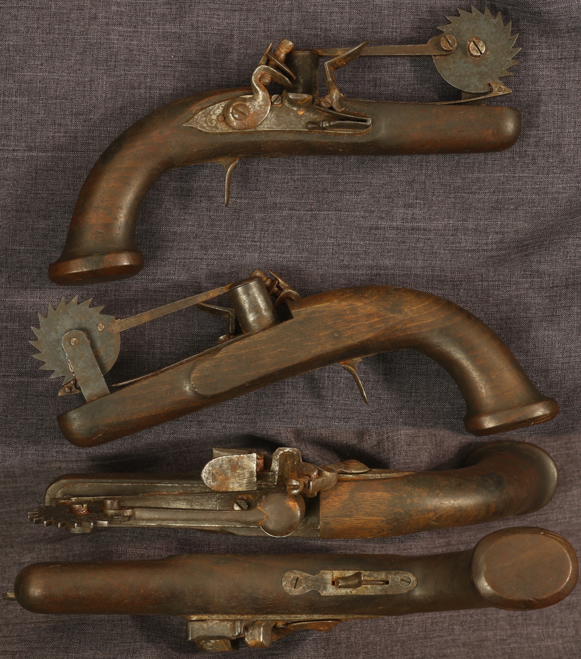 Small flintlock eprouvette (powder tester). About 8-1/2" overall. No markings aside from graduations on toothed wheel. Metal parts have a dark patina overall with minimal surface rust. Stock is very good, showing some minor marks from handling, free of cracks and chips. Hammer has spring tension but does not cock.
