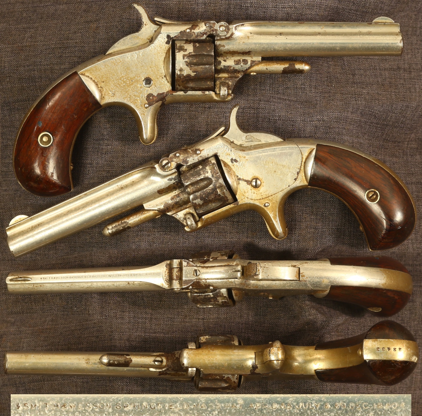 Smith & Wesson first model, third issue .22 caliber spur trigger revolver. Serial number 22433. Antique renickeled parts show scattered flaking, primarily around the front of the cylinder. Wood grips are very good, free of cracks, with one minuscule corner nick. Mechanically good, sold as a collector item only, not warranted safe to shoot.