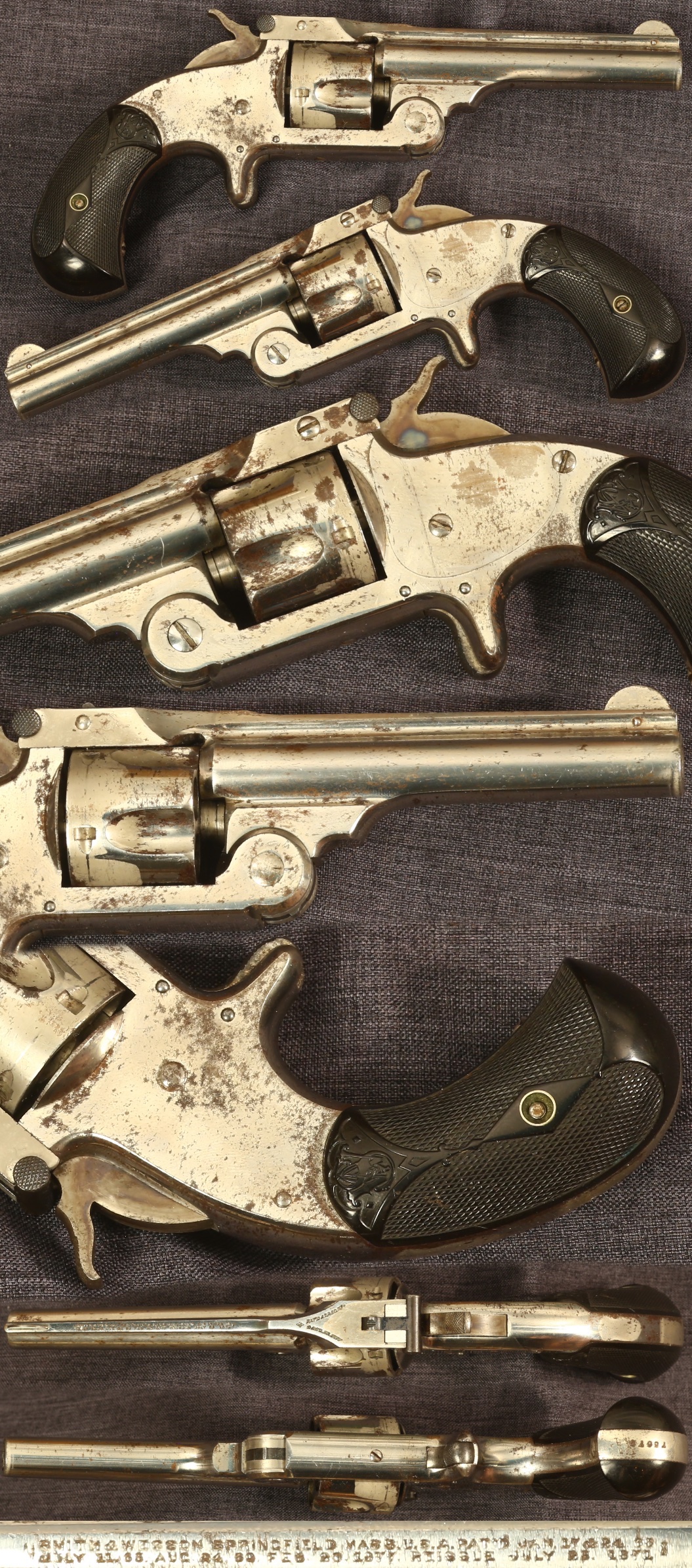 Smith & Wesson No. 1-1/2 SA .32 caliber spur trigger revolver. Serial number 75679. 3-1/2" barrel model. Metal parts have very fine bright original nickel finish, with some small areas of missing finish that show light patina. Hard rubber grips are fine, free of cracks and chips. Mechanically good, sold as a collector item only, not warranted safe to shoot.