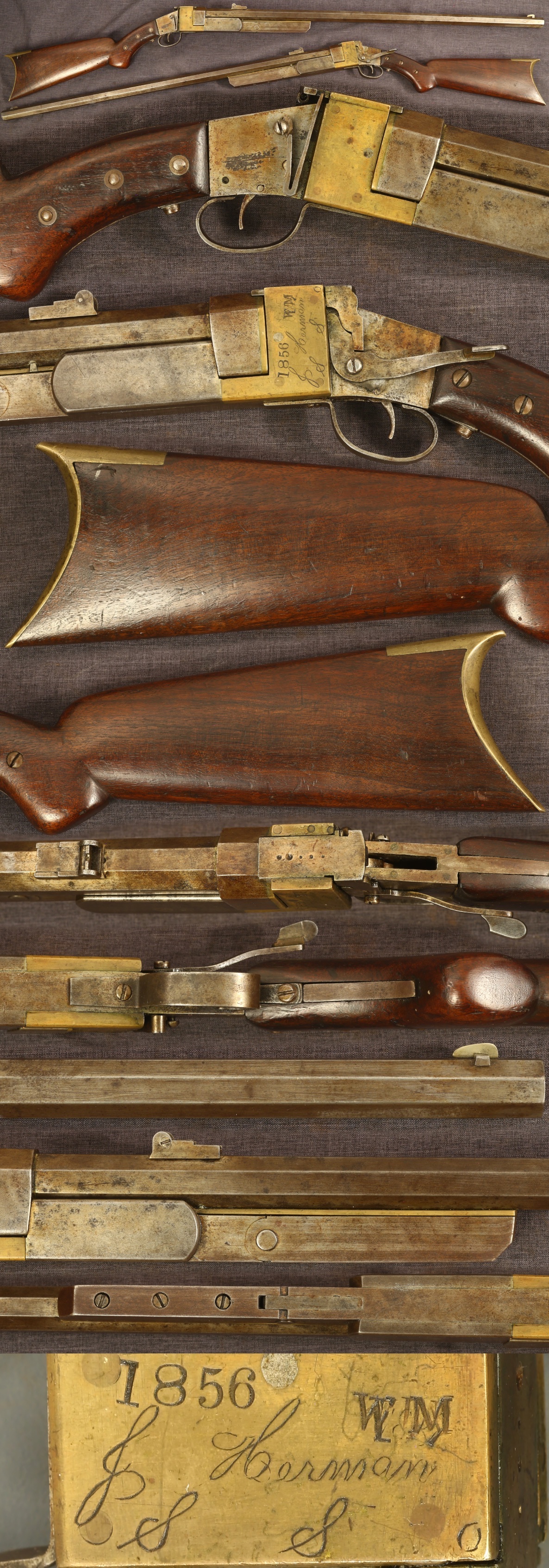 Unique handmade model or prototype break open single shot rifle. 30" octagon barrel of about .40 caliber bore, about 13/16" width, chamber about 0.45", exact chambering unknown. Signed on left side of frame in script "S Herman" and "S S" with stamping "1856" and "WM". Well made and quite heavy with an abundance of solid steel and brass. Metal parts have a medium patina overall. Spurless hammer visible when viewed from above is cocked by pushing the barrel release past the point where it releases the barrel. Wood buttstock is made with a pistol grip, shows scattered marks from handling over the years. Mechanically good, sold as a collector item only, not warranted safe to shoot.