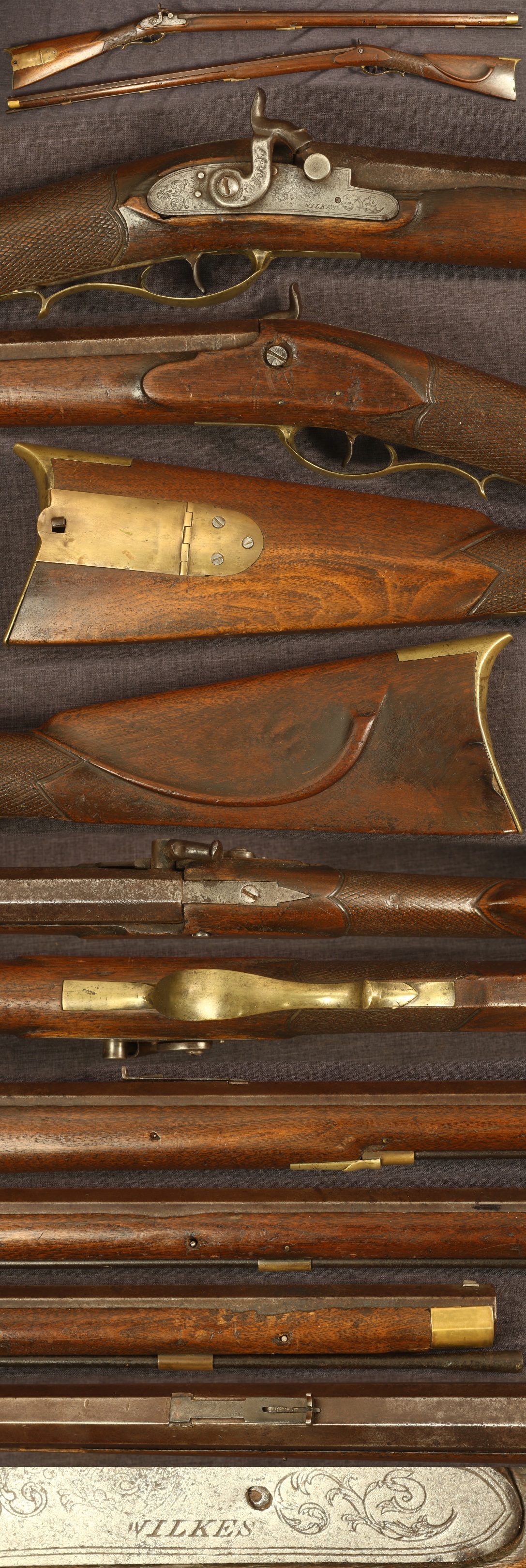 C1840-60 plain percussion walnut fullstock rifle. 36" octagon barrel of 1-1/16" width and 0.49" bore. This stoutly built rifle is of moderate weight. Percussion trade lock marked "WILKES". The barrel has a nice rear sight with elevation adjustment and front sight. Simple rounded patch box with release on lid. Metal parts have a light to medium patina overall with brass parts probably having been cleaned at some point and some expected pitting in the barrel breech area. Walnut stock has nicely bordered checkering in the wrist and an interesting scooped out cheekrest. Wood shows moderate wear and use overall with some chipping around the lock screw and in the right forearm edge, left forearm edge is missing a long sliver associated with some diagonal cracks forward of the rear sight, and a sliver missing above the front of the lock. Mechanically good, sold as a collector item only, not warranted safe to shoot.