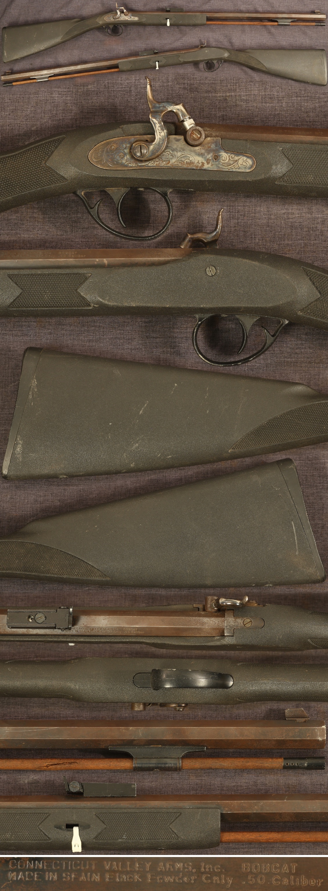 Connecticut Valley Arms "Bobcat" .50 caliber black powder muzzleloading rifle. Metal parts have some scattered rust and wear to finish. Plastic stock has some handling marks. Barrel key and sling swivels are absent. Ramrod is cracked. Lock cocks at half and full. We are not gunsmiths and do not warrant this gun to shoot safely. Please seek guidance from an expert in blackpowder gunsmithing if unsure about the safety and management of this rifle.