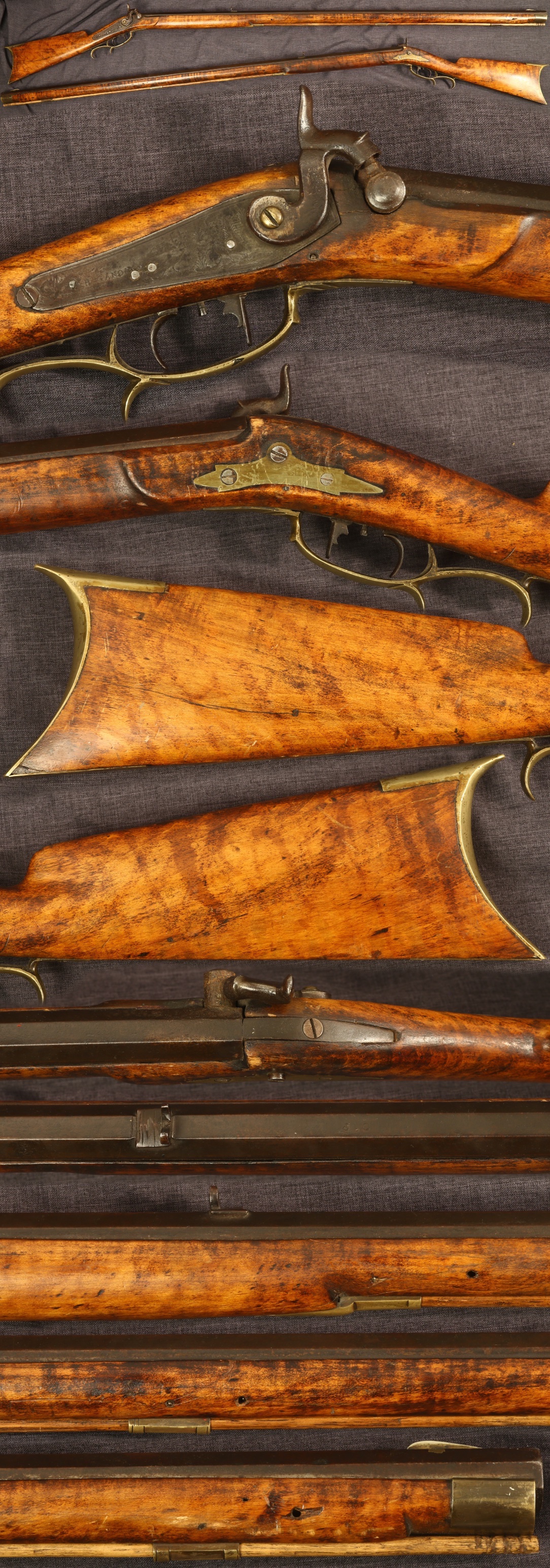 C1870-1900 Ohio percussion fullstock longrifle. Lock marked "H GANO & Co" for Howell Gano & Company of Cincinnati, OH from 1844-1900. Barrel marked "J.C", most likely for Joseph Leonard Clippinger (1852-1929) of New Franklin, OH. 42-3/4" octagon barrel of .35 caliber bore. Metal parts have a light patina on brass furnishings and dark patina on the iron parts with some pitting in the barrel breech area. Stock has a slight curly maple grain, shows average wear and use overall with a light added finish, age check in the right side of the butt, small crack by lock screw, two small cracks in front of the lock, and two small diagonal cracks in the right side of the forearm. Lock functions only with trigger set and does not have half cock. Sold as a collector item only, not warranted safe to shoot.