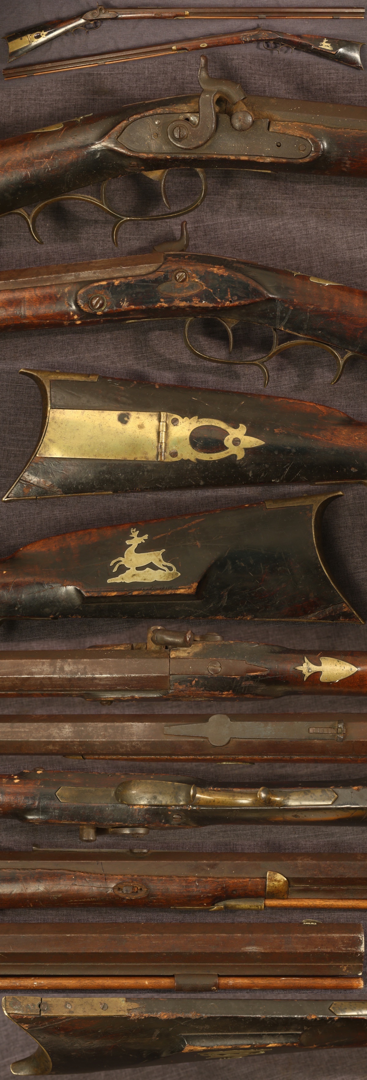 percussion Pennsylvania halfstock plains rifle. No maker marks apparent except "BELL LONDON" on trade lock. 39-3/8" octagon barrel of .50 caliber bore and 1-1/16" width. Large bore and long range rear sight with elevator suggest possible western use. Untouched condition overall except replacement ramrod. Metal parts have a dark patina overall with rear lock screw escutcheon and barrel key escutcheon absent. Nicely shaped plain brass patch box, german silver running stag cheek piece inlay, interestingly shaped wrist escutcheon. Stock is untouched with an old added finish, has a couple minor grain cracks, numerous light to moderate handling marks, some chipping and wear to the lock mortise, and a worn sliver missing from right side of forearm. Hammer has spring tension, but does not cock. Sold as a collector item only, not warranted safe to shoot.