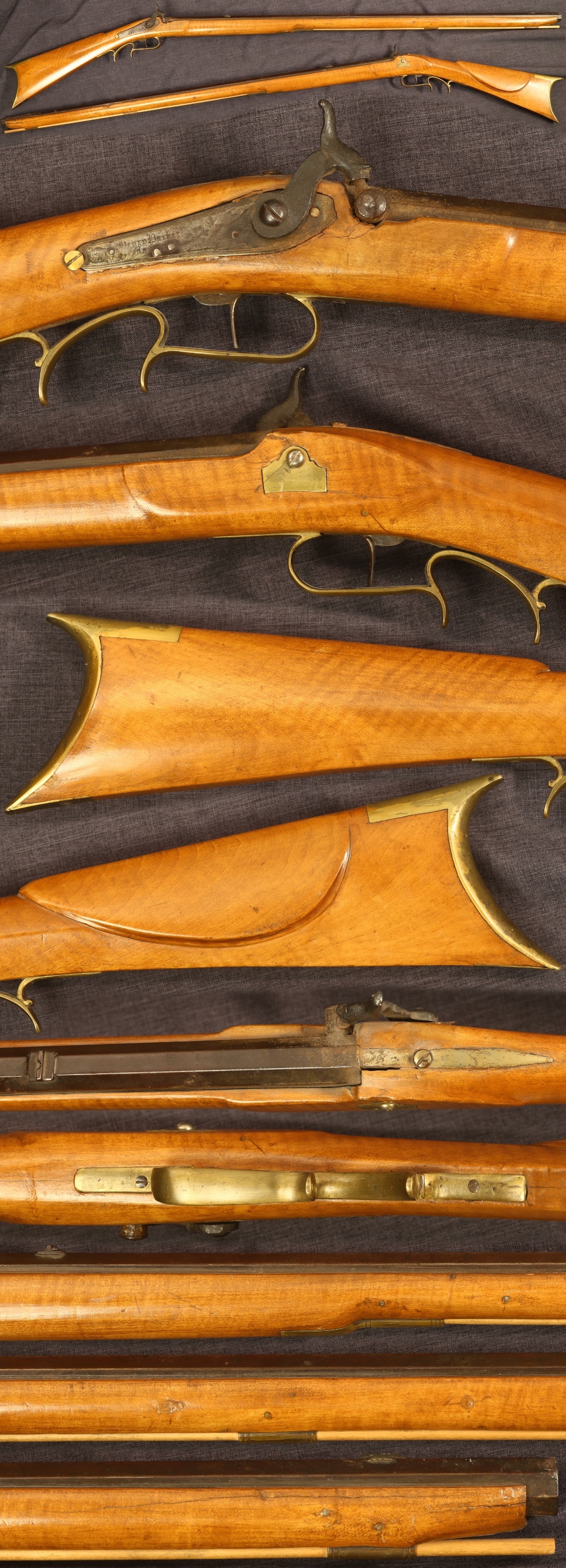 C1840-60 percussion full stock rifle with Henry Parker trade lock. 38" octagon barrel of about .46 caliber bore. Barrel has a smooth, dark patina, lock is lightly cleaned to show marking, brass parts are a light yellow. Stock is a blonde maple with slightly curly grain, lightly refinished, has a couple lateral cracks in the forearm, small crack by side screw, worn chip in left side of forearm edge, and a little wood filler in the edges of the lock mortise. Hammer only has full cock. Sold as a collector item only, not warranted safe to shoot.
