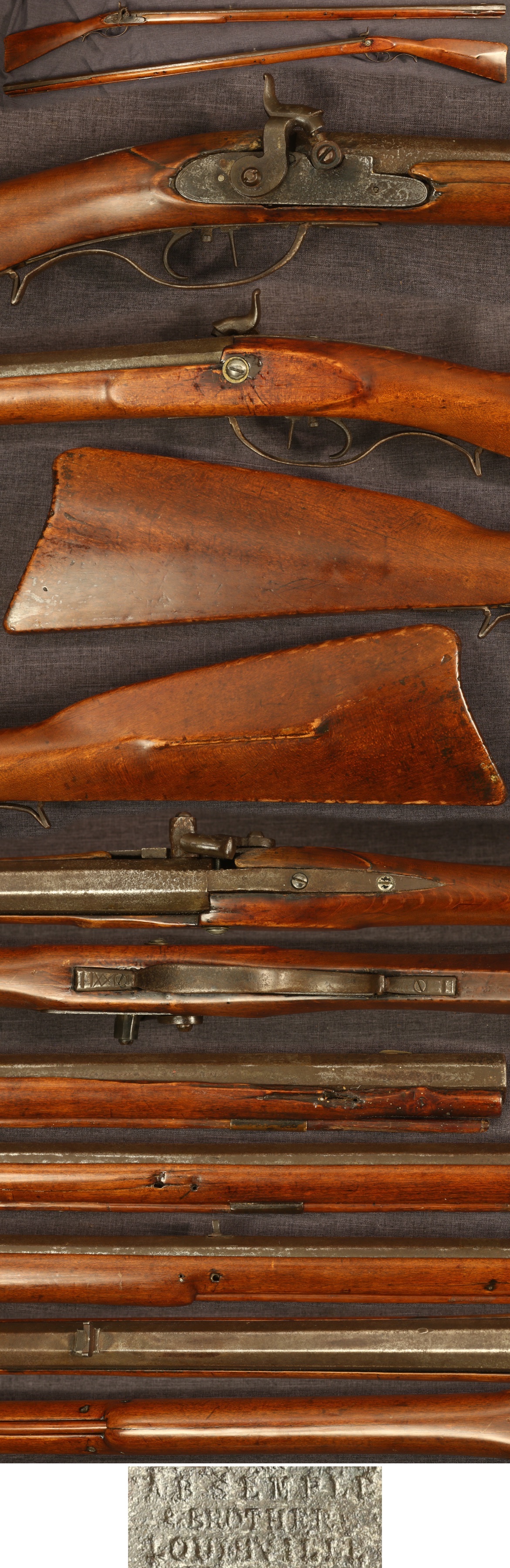 C1850-60 Smoky Mountain region "poor boy" percussion maple fullstock rifle. Percussion trade lock marked "A.B.SEMPLE/& BROTHER/LOUISVILLE" dating the gun to 1850-61, when Semple was using this marking. Bears features of a primitive gun made in the mountains, including long iron barrel tang, handmade iron triggerguard, no ramrod entry ferule, one iron ramrod pipe, one brass ramrod pipe, and made without a buttplate. 43" octagon barrel of 1-1/16" width and 0.43" bore. Nice original open sights and ramrod. Metal parts have a dark patina overall with some expected pitting and erosion in the breech area. Stock is worn smooth with added oil finish from over the years, has some worn missing wood from sides of forearm toward the muzzle, a crack in the bottom of the forearm, lateral crack forward of lock, and a crack between lock mortise and barrel tang. Mechanically good with set triggers, sold as a collector item only, not warranted safe to shoot.