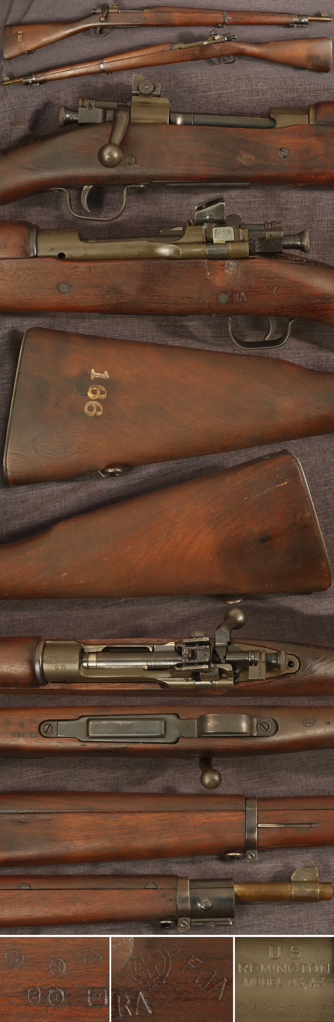 Remington Model 03-A3 .30-06 rifle. Serial number 4128540. Barrel stamping looks like "IA", but appears to be "RA" poorly struck, with a similarly struck ordnance bomb. Also has date of 10-43. Rifle exhibits most of the stamped parts instituted to increase production with the exception of milled lower sling swivel and a 2-groove rifled barrel. Metal parts have good to fine finish overall with some light rust patina on barrel muzzle. Stock is extensively inspector marked, has a couple handling scratches and some added oil. Numeral "166" in right side of butt. Ships to FFL or C&R license holder. Appears to be mechanically functional. Sold as a collector item only, not warranted safe to shoot. Before considering using this arm, we recommend inspection by a professional gunsmith.