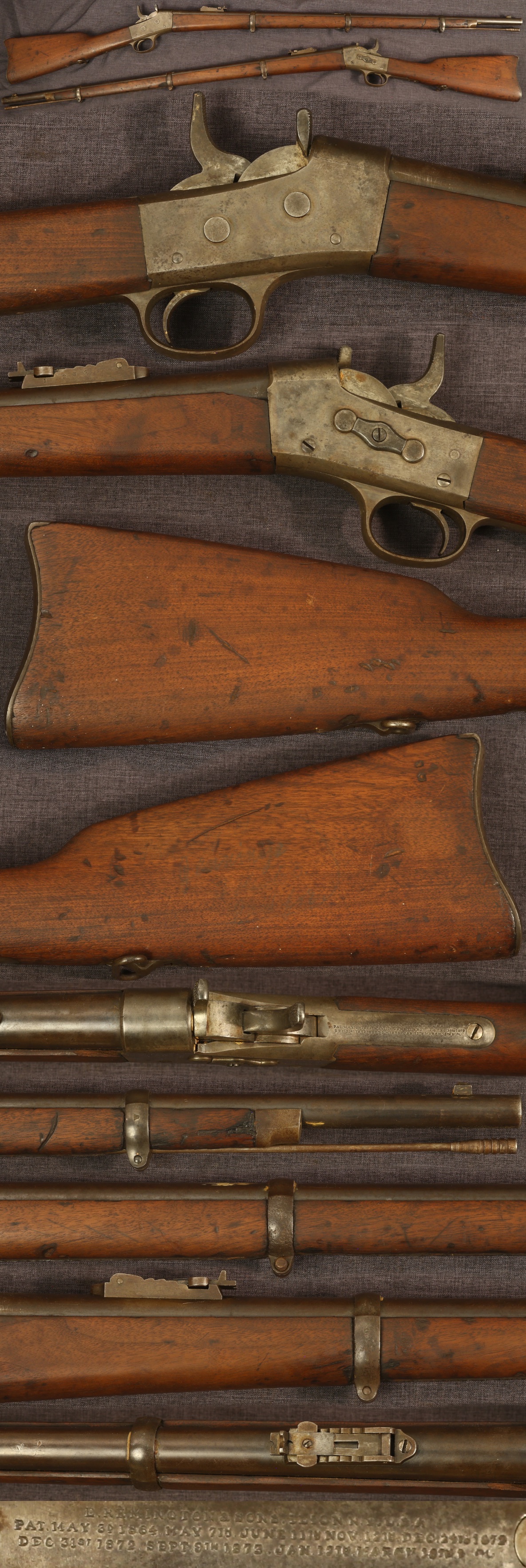 Remington military contract 3-band rolling block rifle. Marking "B" at barrel breech and three line Remington marking on frame tang. 35" round barrel of about .43 caliber, exact chambering unknown. Metal parts have a medium patina overall with some light pitting on the barrel bands. Stock is good, having been cleaned, shows scattered dark spots from moderate handling marks, has a chip by nose cap on right side, flake missing on left side by middle band, and sliver missing on left side of forearm by frame. Mechanically good, sold as a collector item only, not warranted safe to shoot.