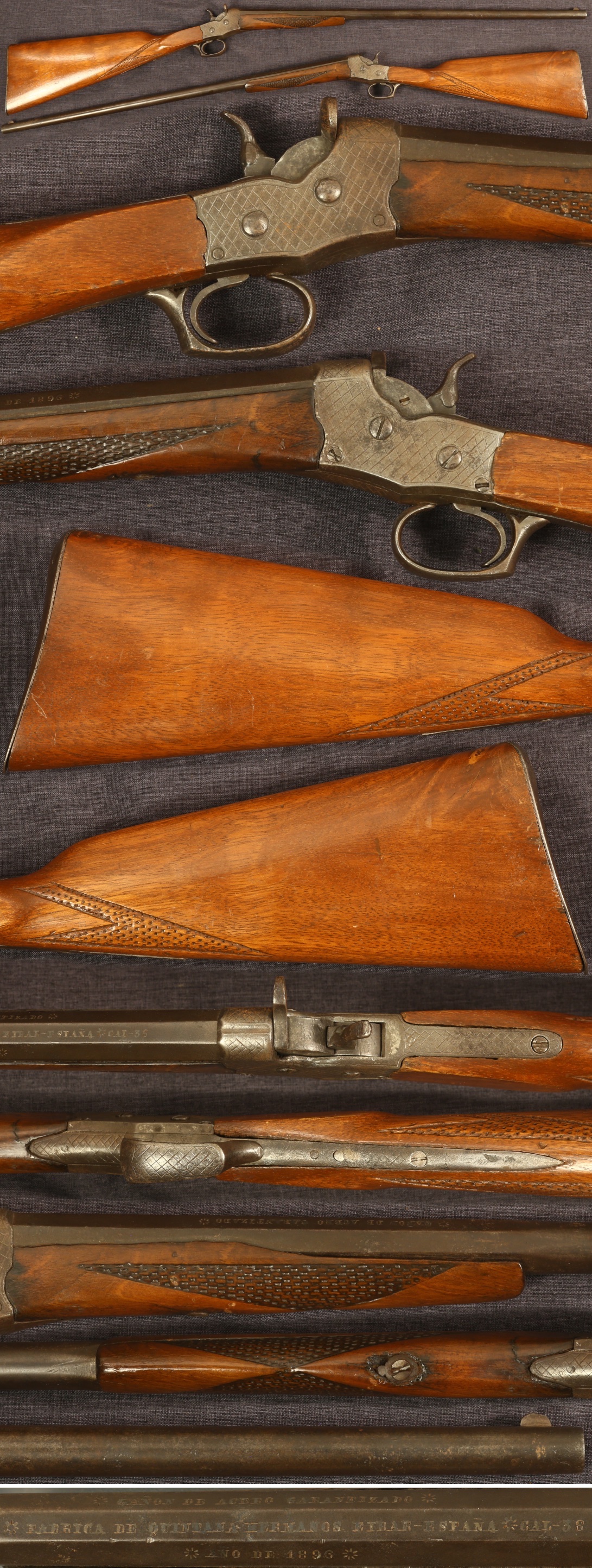 Spanish rolling block smoothbore firearm. Bore measures about 0.34" at muzzle. Inlaid on barrel flats with some silver missing "*CANON DE ACERO GARANTIZADO*/*FABRICA DE QUINTANA HERMANOS EIBAR-ESPANA * CAL - 38/*ANO DE 1896 *" 22" part round, part octagon barrel. Metal parts are good overall with medium patina and crosshatched decoration on frame. Stocks are good, showing light wear and use with carved ornamentation on wrist and forearm. Hammer spur has been reattached. Mechanically good, sold as a collector item only, not warranted safe to shoot.