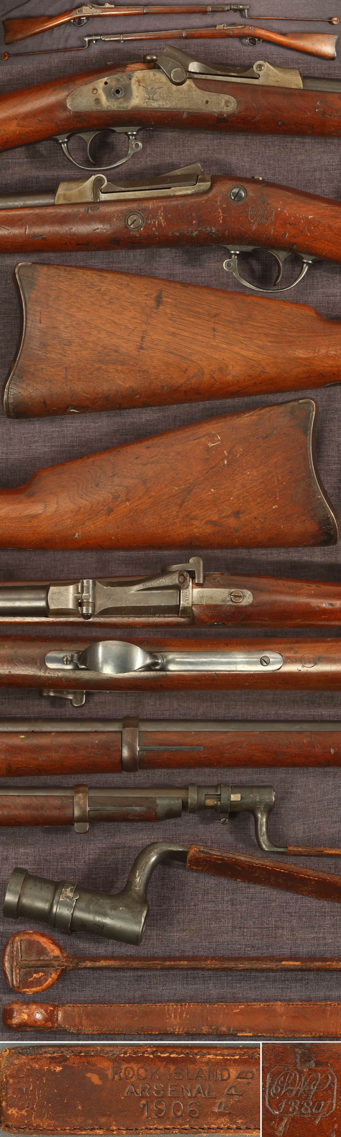 Springfield M1905 (Type III) trapdoor fencing rifle with fencing bayonet. Flayderman 9A-393, only about 1500 produced. Serial number 218672. Nice cartouche opposite lock with date of 1880. Made from a trapdoor rifle, shortened to M1903 rifle length, with hammer, rear sight, and sling swivels removed. Metal parts are a mix of strong original blue finish with areas of light to medium brown patina. Stock shows scattered marks expected from fencing practice, having some minor expected slivering to cleaning rod channel, and a small piece of wood missing above the lock that corresponds to a dent that probably came from parrying a stroke during practice. Barrel still has a fine rifled bore, but is not intended to be fired. Scarce fencing bayonet is boldly marked with date of 1906, leather covering is mostly original brown finish with some scuffing from use. Sold as a collector item only, not warranted safe to shoot.