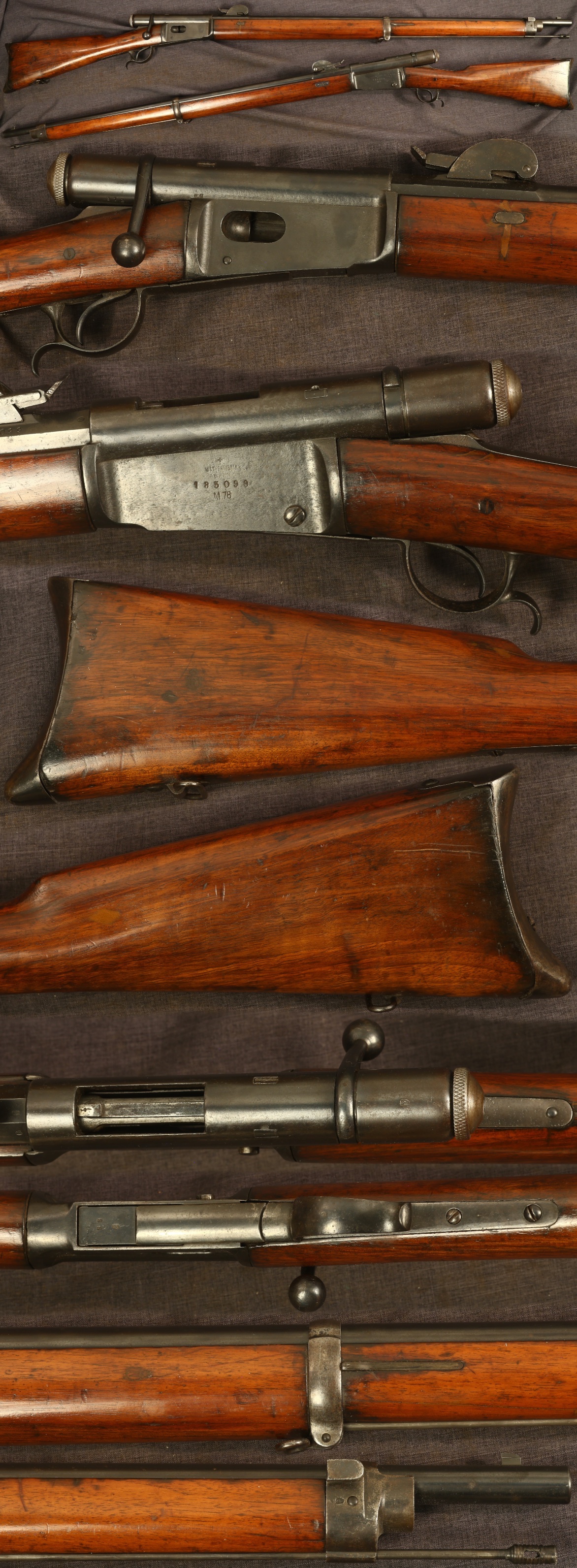 Swiss M1878 Vetterli rifle. Serial number 185099. Metal parts are reblued surfaces with light pitting. Stock is lightly refinished with a minor chip in toe of butt and a filled gouge by the barrel key. Bolt spring appears to be broken/missing. Sold as a collector item only, not warranted safe to shoot.