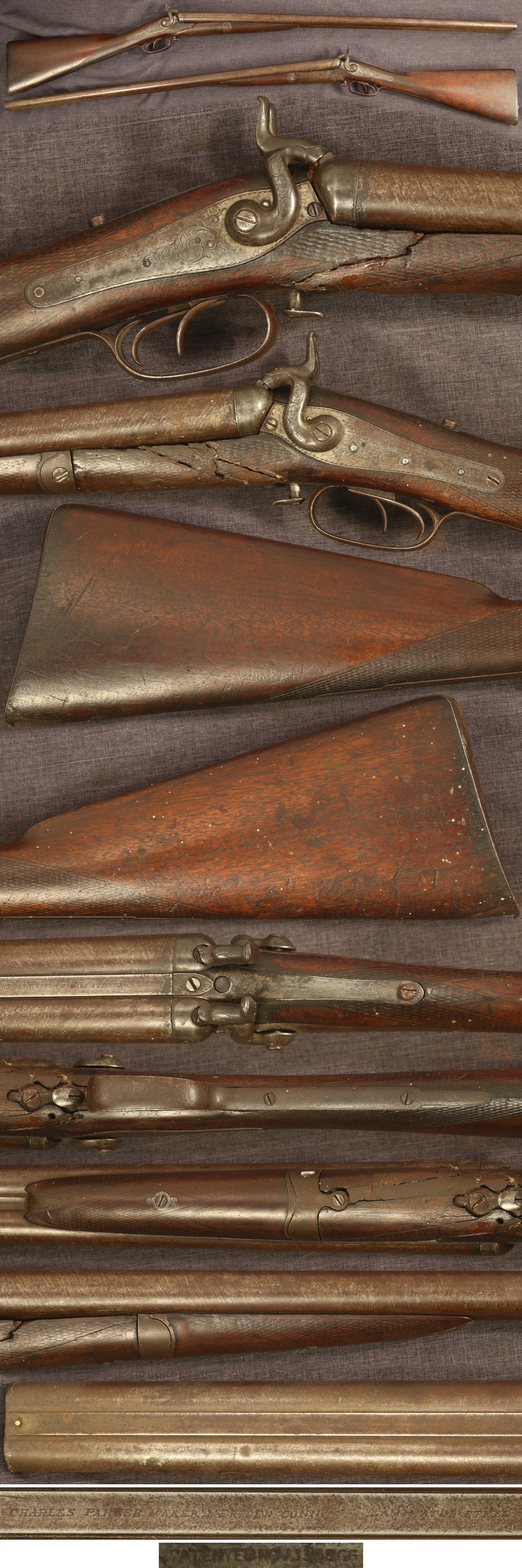 Rare early, pre-Parker Brothers double barrel twist shotgun by Charles Parker. An excellent article on the origins of Parker Brothers can be found here. This type is described in the article as a "variation that looks like [the earlier] Meriden Manufacturing gun without having the T-latch." This gun is serial number 20, with the article noting the highest observed number being 24, with a possible estimated production of 40. Shortly thereafter, the design evolved to the more familiar Parker Brothers underlifter action, but with a back action lock and Charles Parker marking. This gun is marked on the barrel rib "CHARLES PARKER MAKER MERIDEN CONN LAMINATED STEEL" with small patent marking on tang of frame. 29-1/2" barrels, 12 gauge bores. Nicely engraved locks. Metal parts have a medium to dark gray-brown patina overall. Stock is checkered in wrist and forearm, showing expected wear and marks from handling in the butt, while showing more wear and extensive cracking in the rear portion of the forearm. Forearm tip insert replaced long ago. Right lock has spring tension but does not cock, left lock mechanically good. Sold as a collector item only, not warranted safe to shoot.