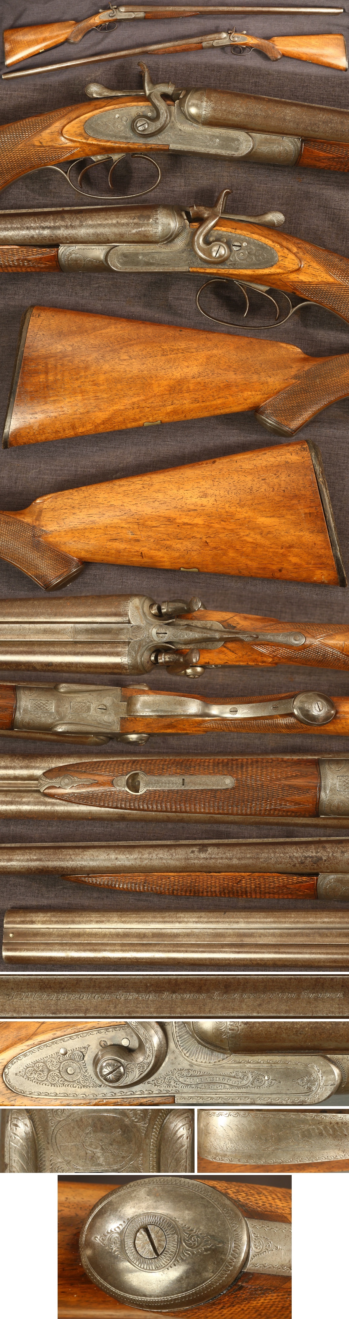Fine English double barrel twist shotgun by J.P.Clabrough & Bros., as marked on locks. Additionally marked on barrel rib "J.P.CLABROUGH & BRO'S LONDON LAMINATED STEEL". Serial number 2457. 30" barrels, 12 gauge. Finely-executed engraving including on pistol grip cap and vignettes of dog on triggerguard and bird on underside of frame. Left hammer is a period replacement. Metal parts have a light to medium patina with a little rust on the barrels. Stock is good, checkered in wrist and forearm, having a light added finish, a small sliver missing from left forearm edge by frame, and some expected handling marks overall. Ribbed horn buttplate is worn and missing a sliver. Mechanically good, sold as a collector item only, not warranted safe to shoot.
