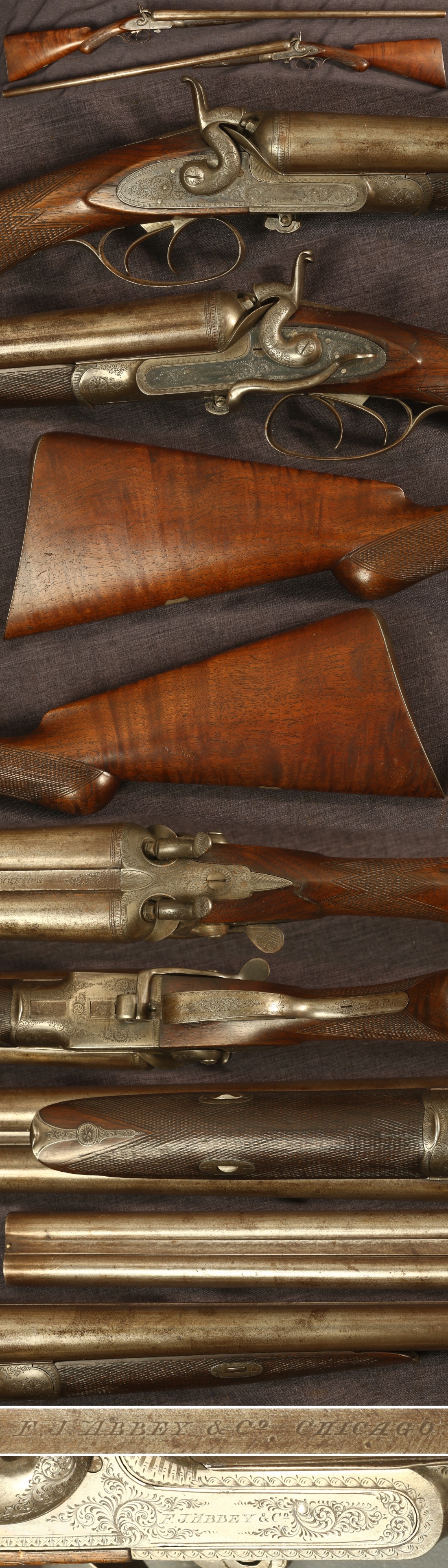 English made side lever double barrel cartridge shotgun marked on barrel rib "F.J.ABBEY & Co CHICAGO" and on locks "F.J.ABBEY & Co". Serial number 1612. Frederick J. Abbey & Co. operated in Chicago, Illinois from 1858-1878, selling a variety of firearms. 10 gauge, 30" barrels. Very nicely engraved overall with attractive light patina to metal surfaces. Stocks are nicely grained and checkered, showing minor handling overall, with a crack above the left lock. Mechanically good, sold as a collector item only, not warranted safe to shoot.