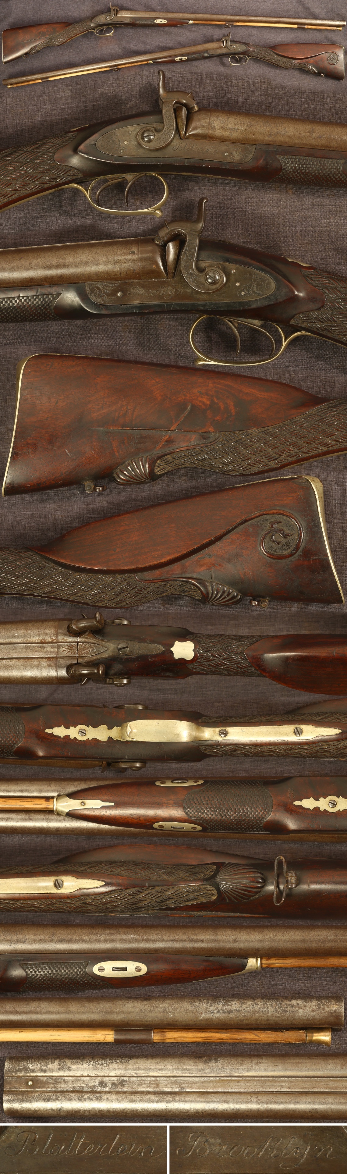Fancy carved double barrel percussion shotgun, signed on locks "Blatterlein" and "Brooklyn". 30" barrels, 12 gauge. Locks are nicely engraved, nicely shaped german silver mountings. Equipped with sling swivels in the European fashion. Metal parts have a light to dark patina overall. Stock is a nicely figured walnut, has a small crack in a knot in the butt and a light crack in front of the right lock. Stock is intricately carved in a basketweave pattern in the wrist, large cheek piece with spiral tail, and interesting patterned embellishment to the forearm. Mechanically good, sold as a collector item only, not warranted safe to shoot.