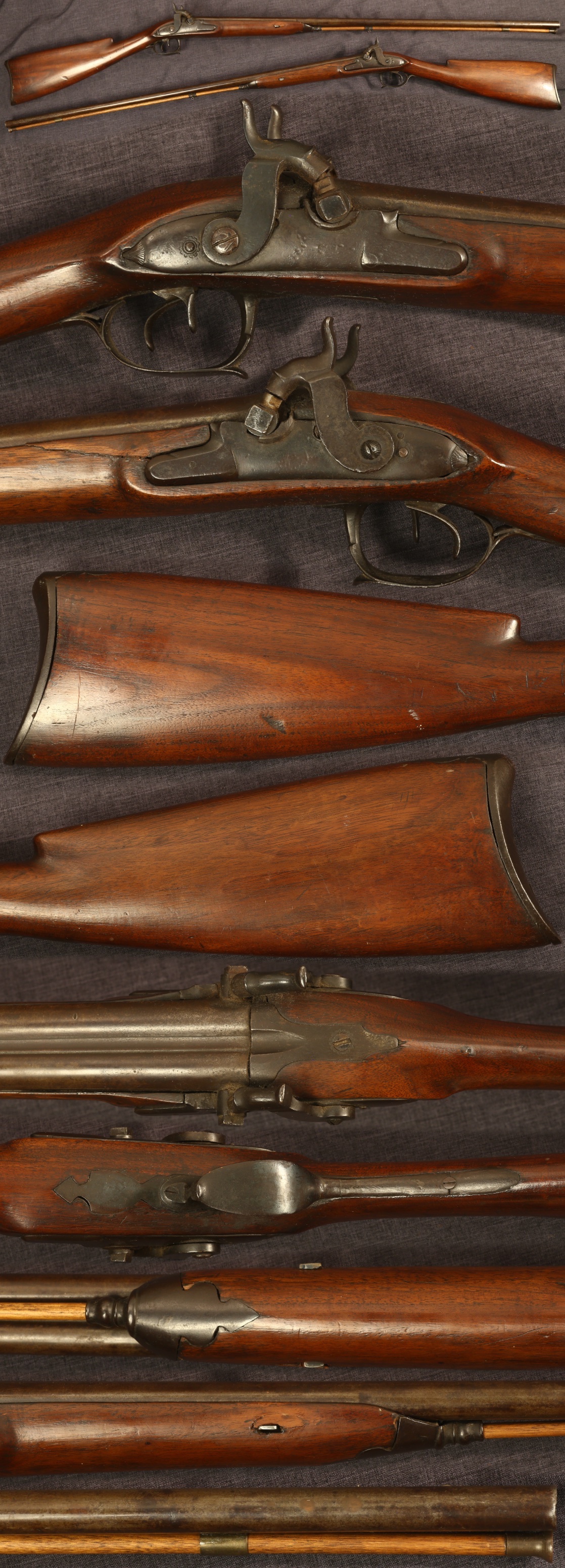 Early percussion conversion double barrel shotgun. 32-3/4" barrels, about 0.56" bores. Metal parts have a dark patina overall. Hammers are close but do not match. Nicely shaped buttplate, triggerguard, and ramrod ferule. Stock is good, may have been lightly refinished, has a small crack by the barrel key. Mechanically good, sold as a collector item only, not warranted safe to shoot.