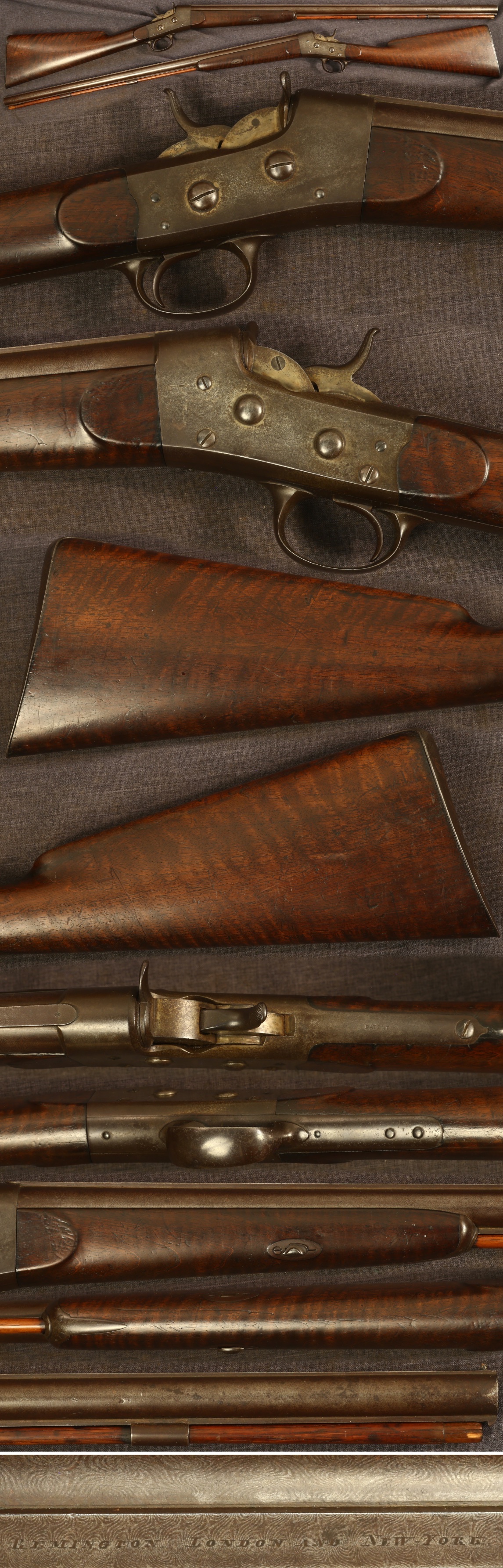 Fancy Remington-Nagant rolling block shotgun. 16 gauge, 30" barrel. Marked on top rib "REMINGTON NEW YORK AND LONDON", ELG proofed on bottom of barrel, "PATENT" marked on frame tang. Metal parts have a medium patina overall with fancy damascus finish on barrel. Flip-up trap in buttplate with storage for two shotshells. Nicely figured walnut stocks show average wear and use with some worn handling scratches and a vise impression on each flat of the forearm. Barrel key has a chip missing and cleaning rod is missing its brass tip. Mechanically good, sold as a collector item only, not warranted safe to shoot.