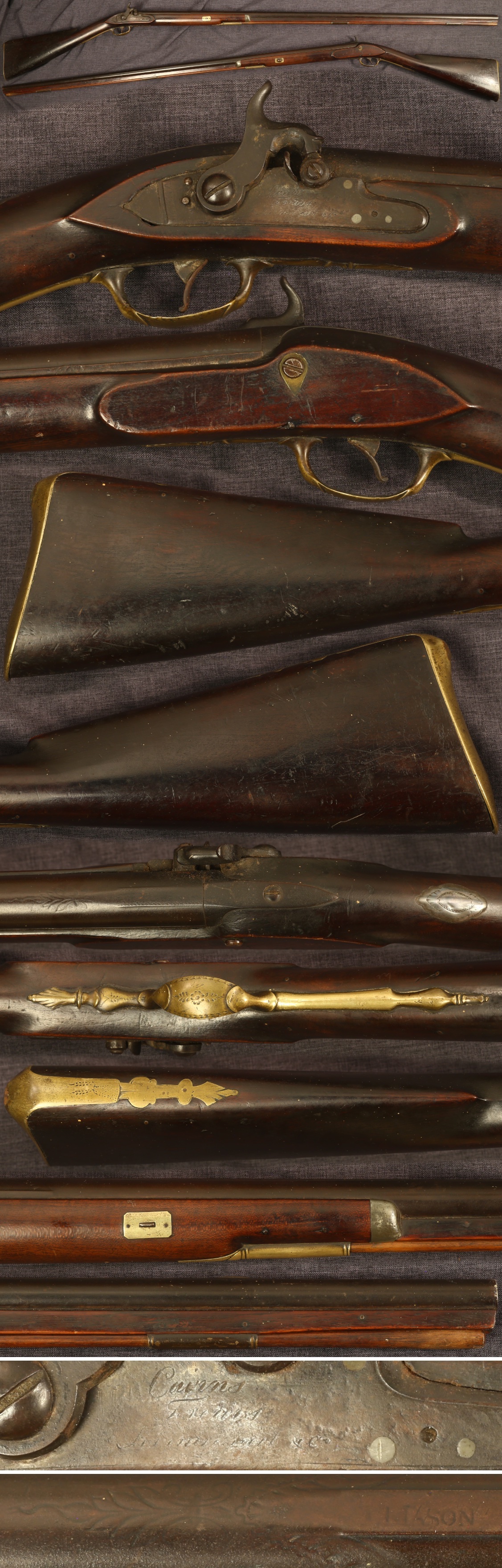 Attractive C1820-40 percussion conversion New England halfstock fowler. Marked "J.MASON" (Taunton, Massachusetts) on top of barrel Taunton, Massachusetts. Lock marked "Cairns" in script with additional markings that are hard to read. 41-3/8" ribbed round barrel with fancy sculpted breech section, bore about 0.52". Stock possibly of cherry, with wooden ramrod rib often observed on New England guns. Fancy buttplate tang, triggerguard, and silver wrist escutcheon. Metal parts have dark patina on iron parts with a light patina on brass parts. Stock is very good, showing honest wear and use with scattered minor marks, minuscule hairline crack by lock screw, otherwise free of chips and cracks. Mechanically good, sold as a collector item only, not warranted safe to shoot.