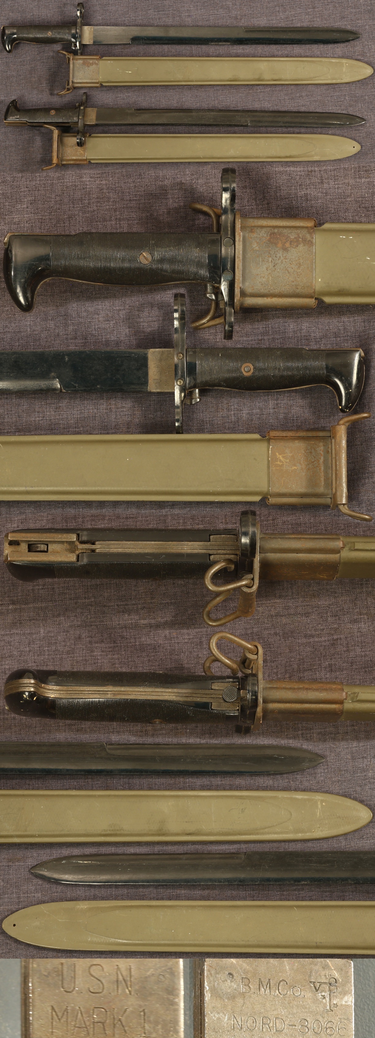 | USN MK1 training bayonet in USN MK1 scabbard, scarce PBCo contract, muzzle ring cracked | Fair | $225.00 |