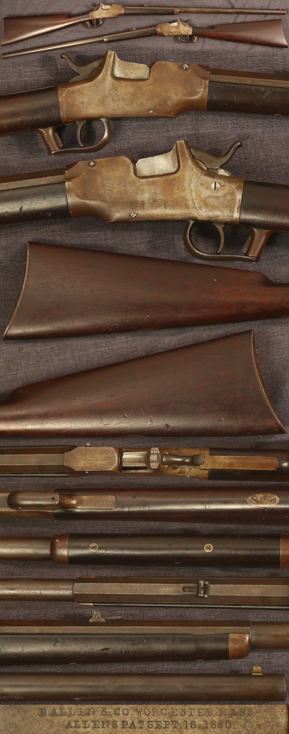 Ethan Allen "Drop Breech" military style carbine. Serial number 2285. 26" part octagon, part round barrel, 44 caliber rifled bore. Marked on top of frame "E.ALLEN&CO.WORCESTER.MASS/ALLEN'S PAT SEPT 18 1860." This style Allen, with the conventional rear sight, and large bore, is most associated with military use, though there was not a United States contract for them. Originally had sling swivels on a barrel ring and in a plate (still present) in the belly of the butt. Barrel has a plumb patina, frame and other metal parts are a medium brown patina. Stocks are very good, showing light wear and use with a couple light dings, a small sliver missing from right forearm edge near tip, and a small hairline crack rear of lower frame tang. Mechanically good, sold as a collector item only, not warranted safe to shoot.