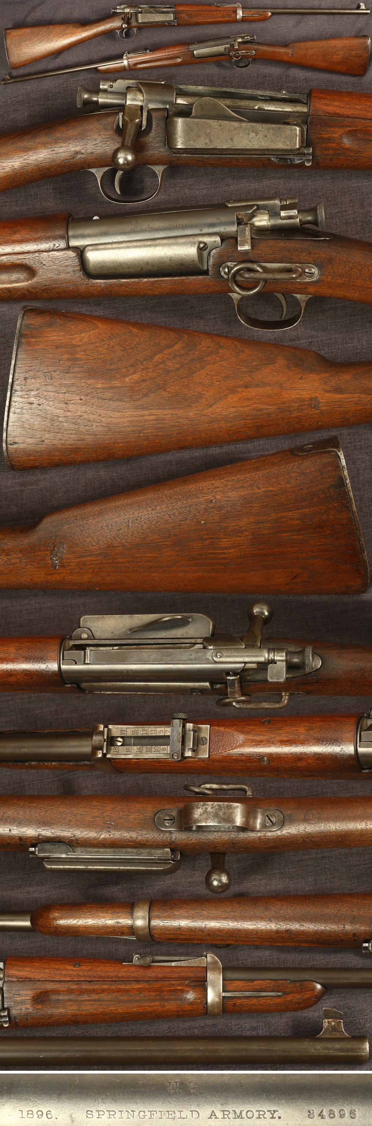 antique US Springfield Krag pre-M1896 carbine. Only dated "1896" on receiver, no "MODEL" marking. Serial number 34896. Made in 1896, previous owner indicated in the month of June. 22" barrel. No cartouche visible on left side of stock, "P" firing proof is present behind triggerguard. Metal parts are mostly a plum patina with a little rust on the triggerguard and buttplate. Stock shows honest wear and use with a light added finish, and a couple handling marks in the wrist, and a small circle scribed on the right side of the butt. Mechanically good, sold as a collector item only, not warranted safe to shoot.
