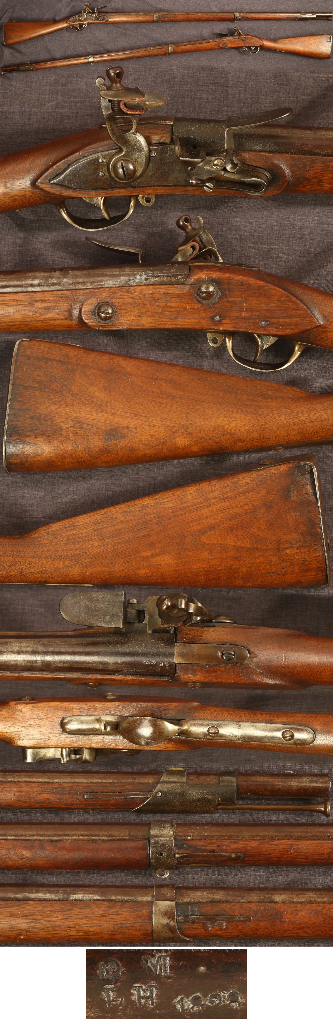 1828 dated flintlock Massachusetts militia musket utilizing early French proofed lock. M1808 style configuration with rounded triggerguard and three barrel bands. 42" round barrel with date and proofs at breech, barrel surfaces show some scattered old tool marks. Metal parts have a light to medium mottled patina overall with some pitting in the flash hole area. Sling swivels area absent. Stock shows light wear and use with scattered handling marks, with some moderate marks to the ramrod channel from being rested while being fired, and some marks by the lower barrel band spring. Rear of barrel tang shows a small chip and crack, crack by rear lock screw, and a small flake missing by the buttplate on the left side.