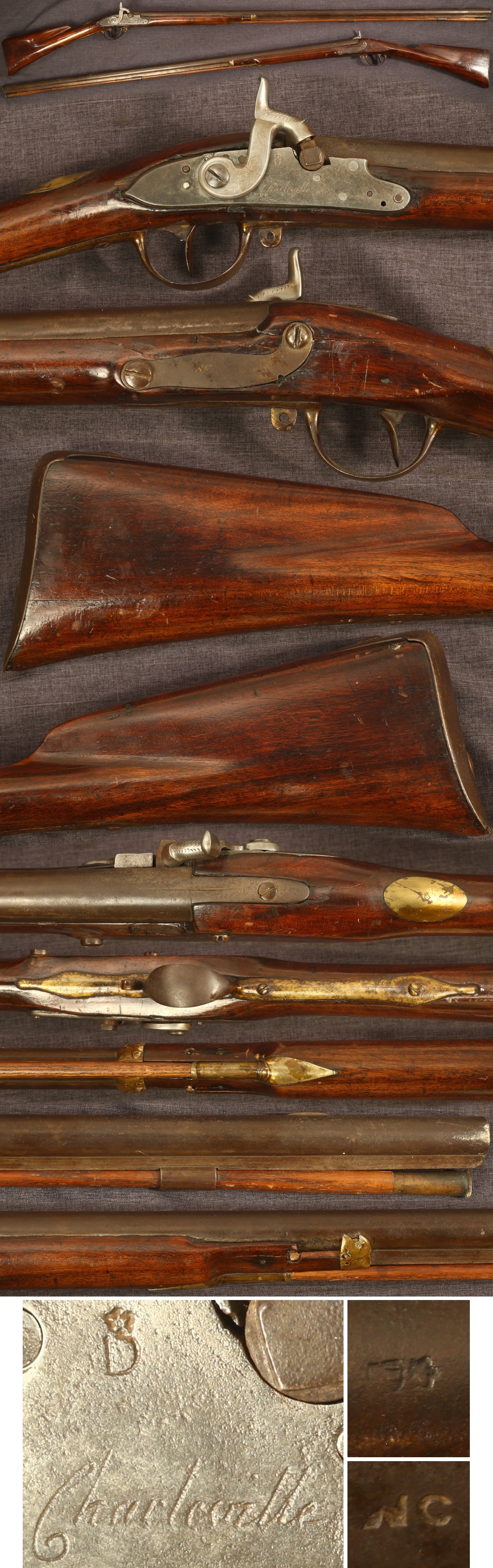 American restocked French Charleville M1766 musket. Original length 44-3/4" barrel with proof at breech and long sporting blade sight applied near muzzle. Sideplate is proofed, lock is boldly marked and proofed. Lock is cleaned, other parts have a medium to dark patina except triggerguard that was protected by some varnish. Stock is fashioned in an American "Roman nose" butt profile, shortened to half stock configuration with ramrod mounted in a rib under the barrel. Furnishings are French military, except the domed oval wrist escutcheon, ramrod entry ferule, and forearm cap. Stock has an added varnished finish, has couple cracks by the sideplate, small chip in toe of butt, a couple small cracks by barrel tang, small chip in lock mortise, and a couple chips/slivers to forearm edge near forearm cap. Has a nice antique ramrod utilizing an early UMC .45-70 cartridge casing headstamped "R B". Mechanically good, sold as a collector item only, not warranted safe to shoot.